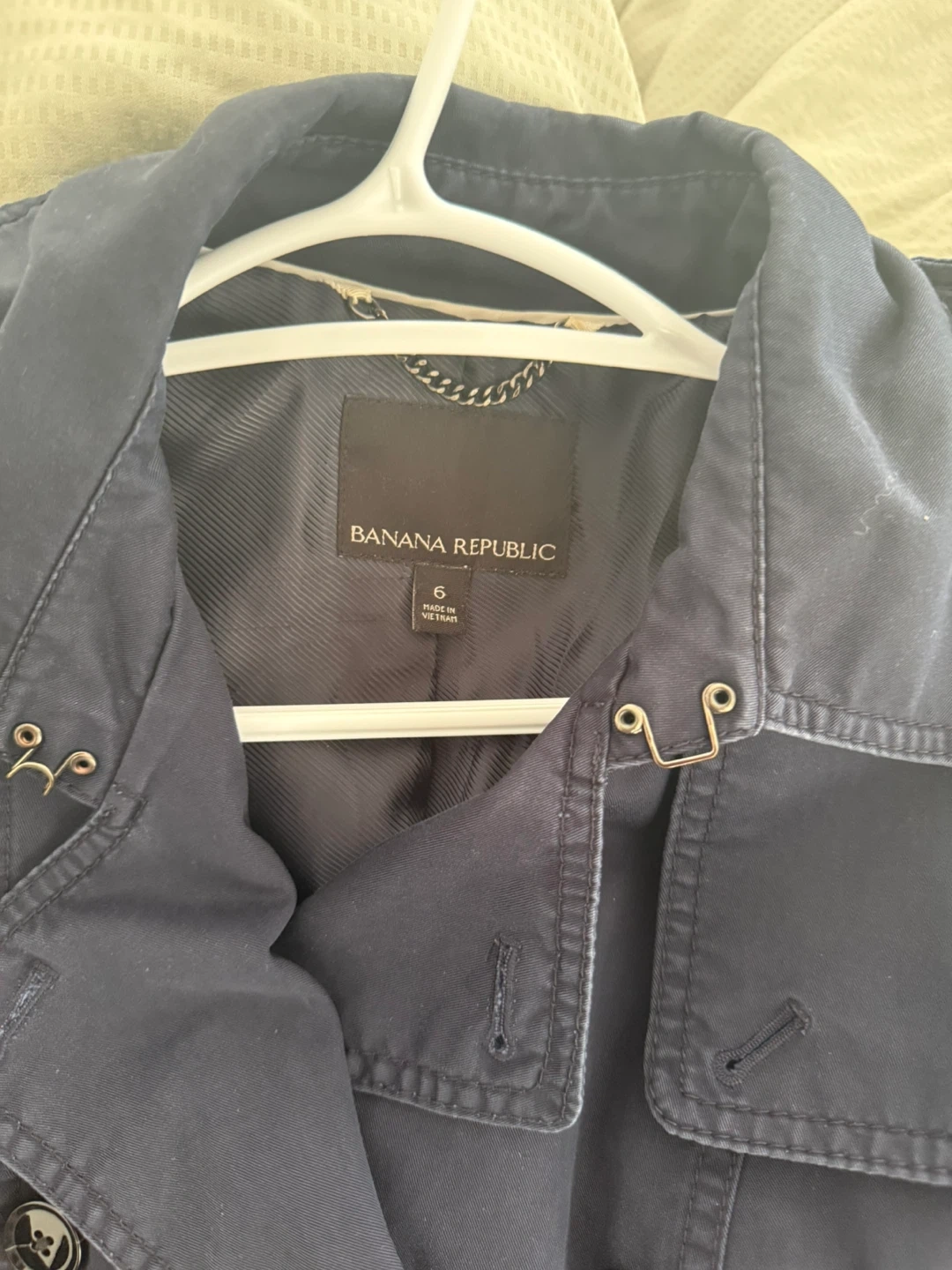 Banana Republic trench coat in navy blue. It's a double-breasted style with a belt. Size is 6.