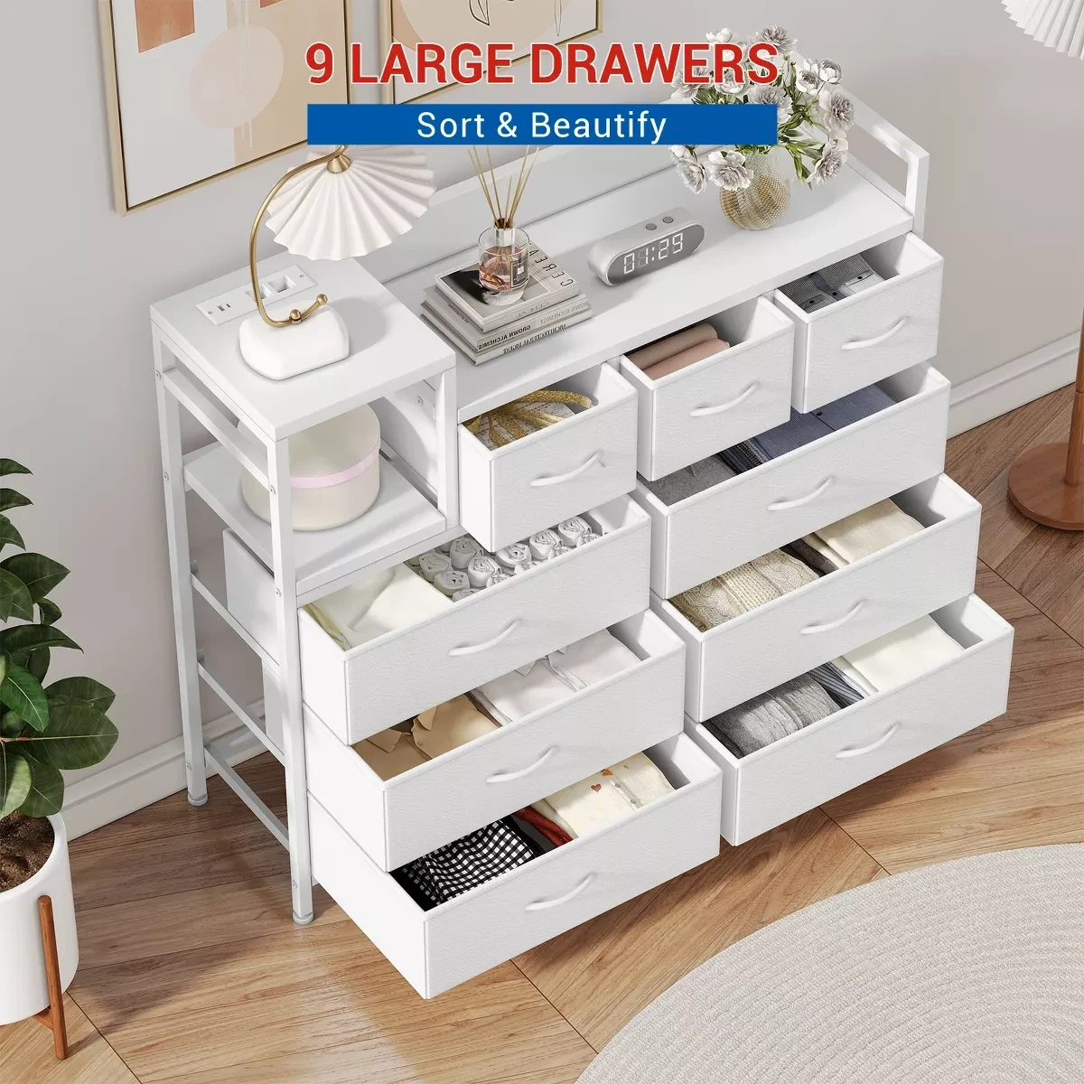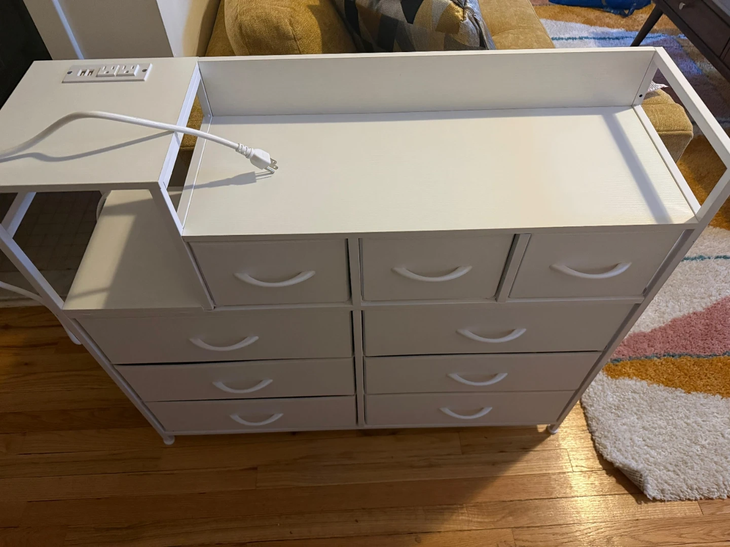 This white dresser has 9 large fabric drawers for sorting and storing items. It's 39.0 inches wide and 33.9 inches tall. Includes a built-in power outlet strip on the top shelf for convenient charging!