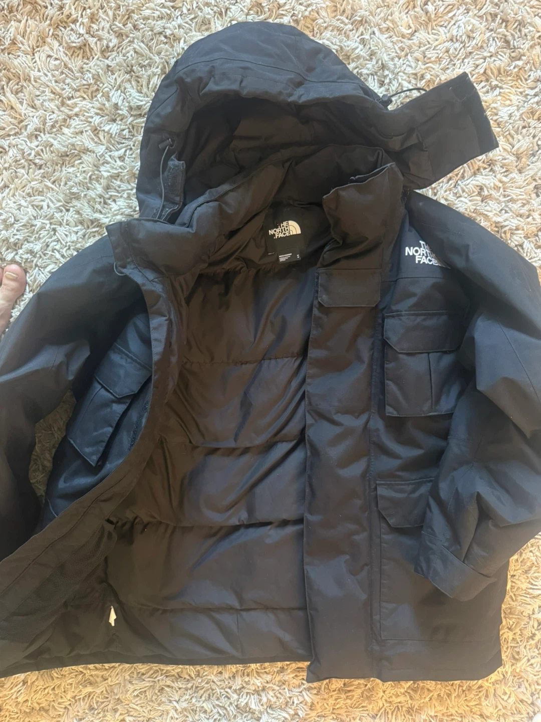 This black puffer parka jacket is from The North Face. It features a hooded design and multiple chest pockets. The jacket is insulated for warmth. size M.