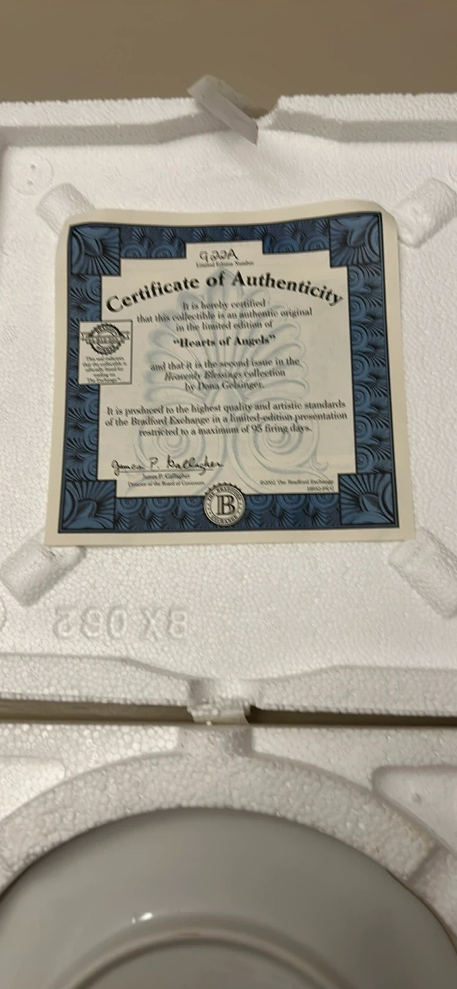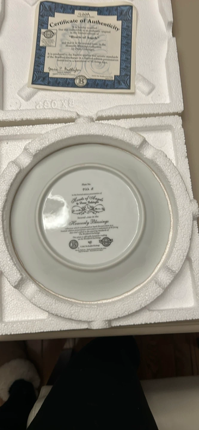 Selling a Bradford Exchange collector's plate from the Hearts of Angels series! It comes with a certificate of authenticity and the original packaging