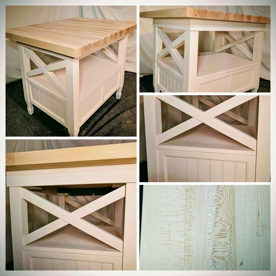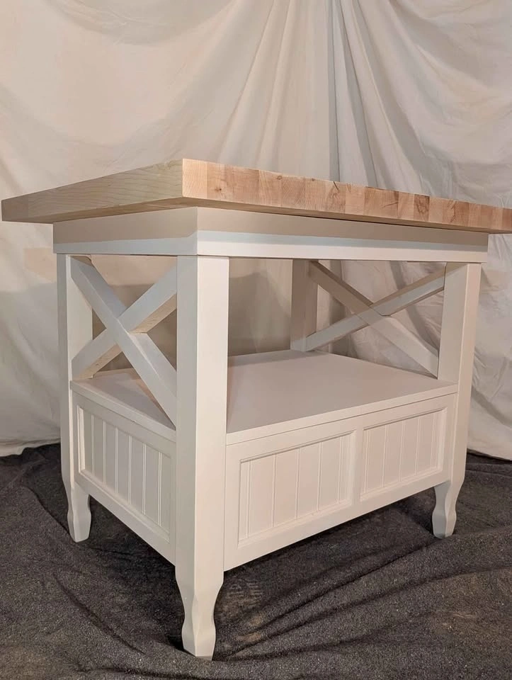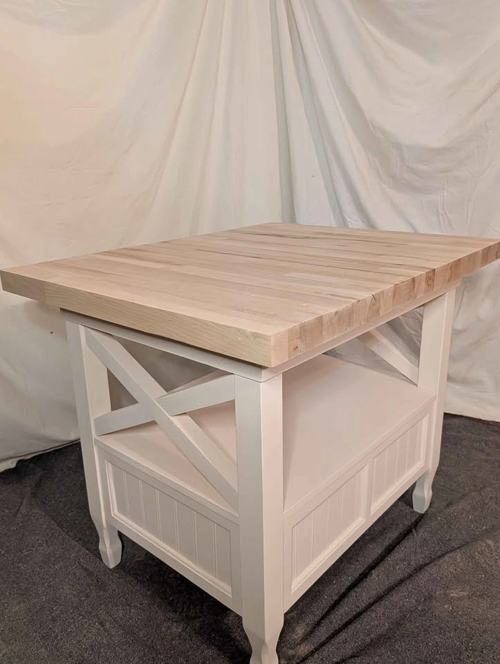 Freshly made. Off white base. Thick heavy top. Custom one-of-a-kind piece. You won't find another one. Top can be conditioned with butcher block oil or sealed with polyurethane, depending on how you plan to use it. Top is 3ft by 29", and the table is 30" tall.