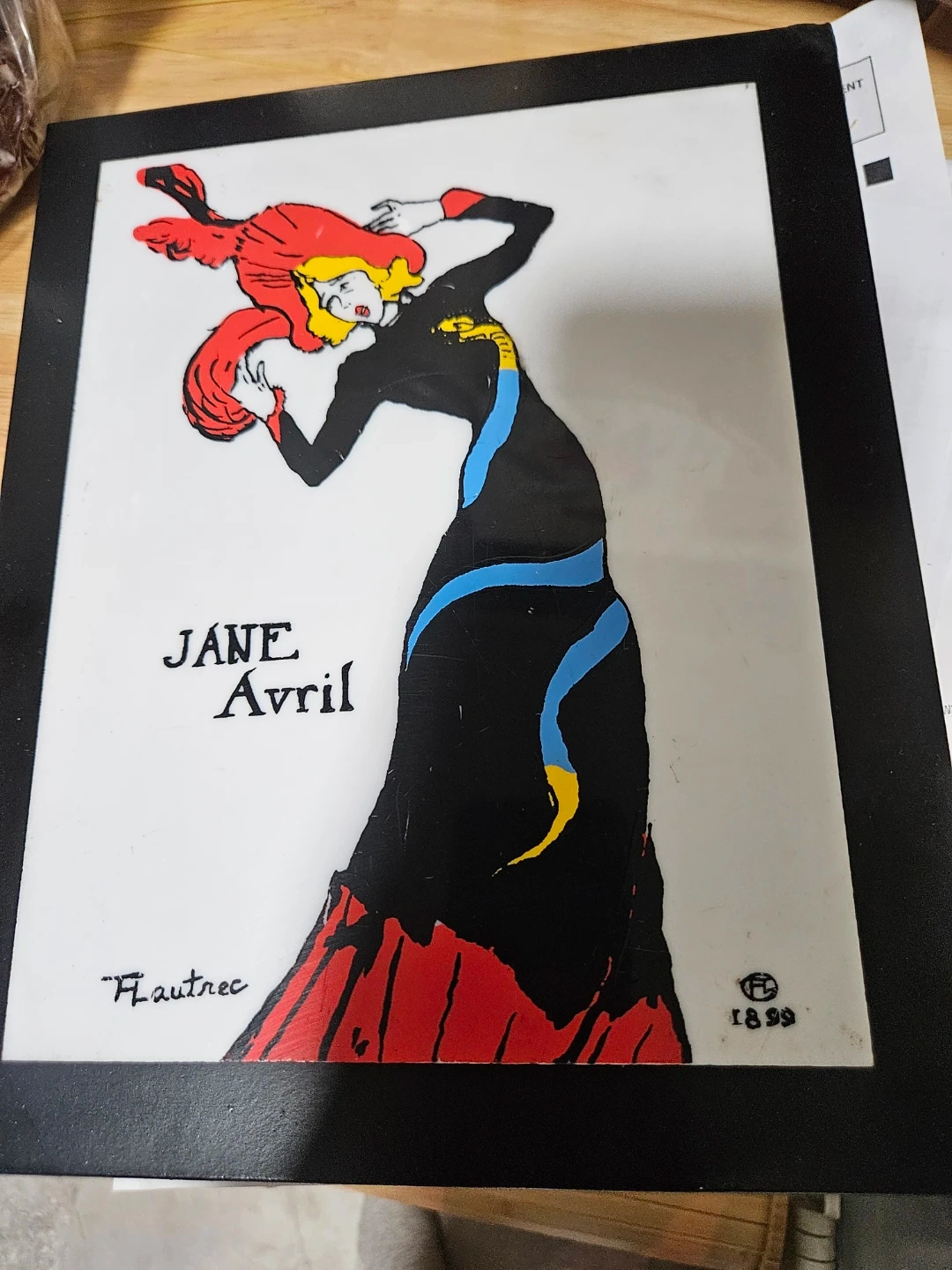 Framed art print featuring Toulouse-Lautrec's "Jane Avril" from 1899. The print is in a black frame with a hanger on the back. It showcases a striking image of Jane Avril in a black dress with red accents.ART Deco Was-$-240