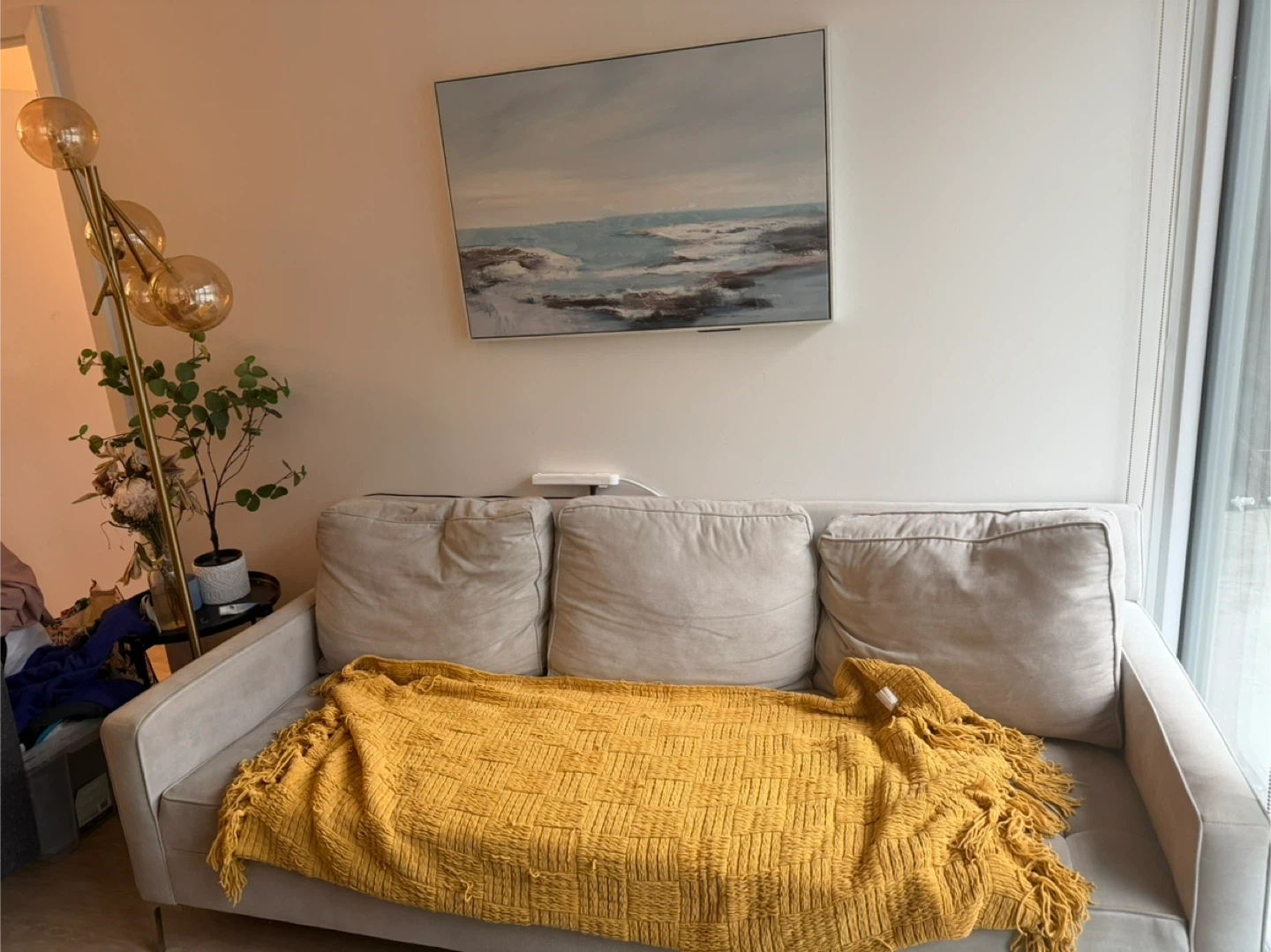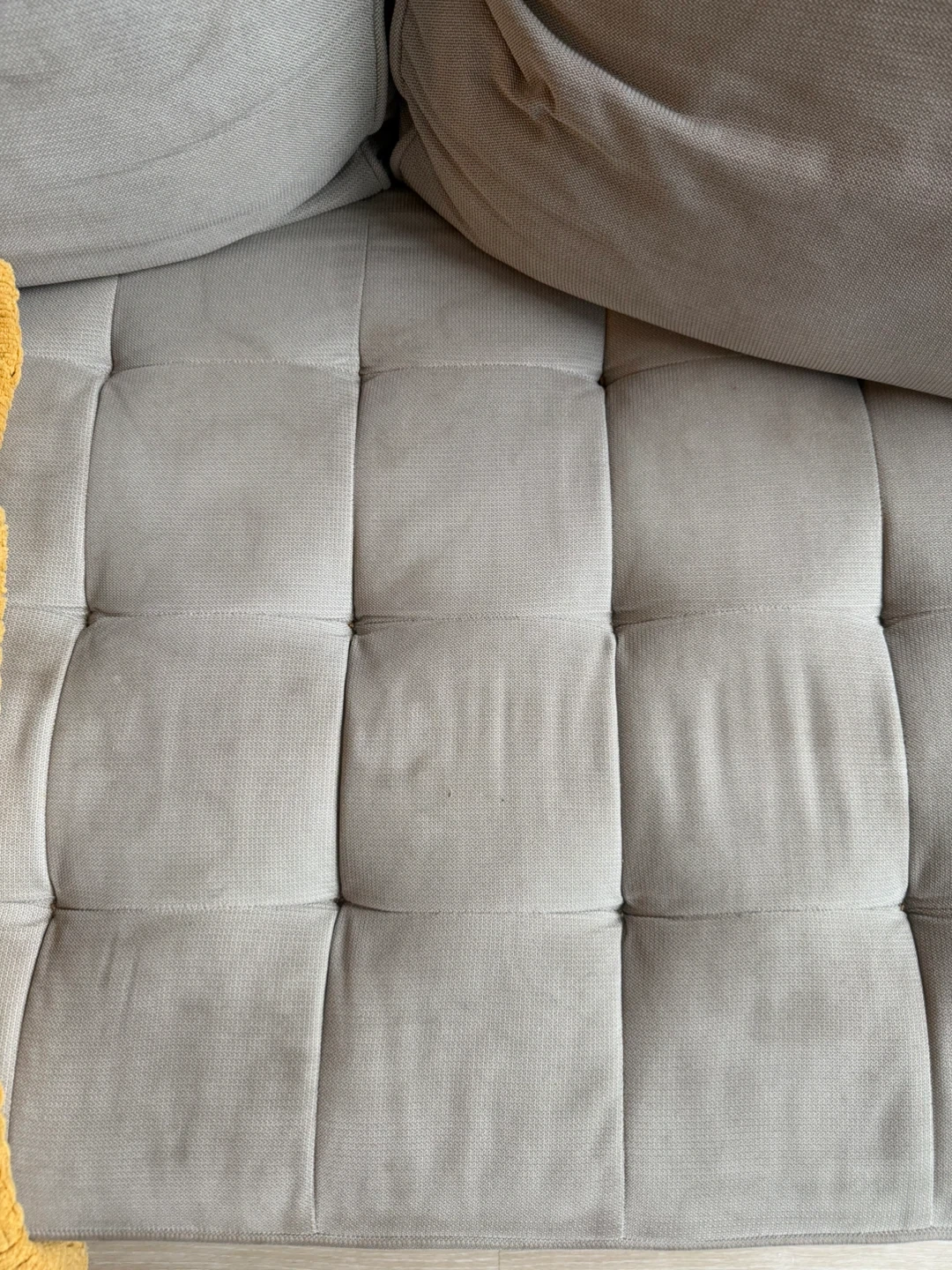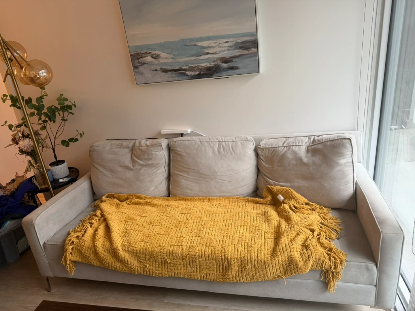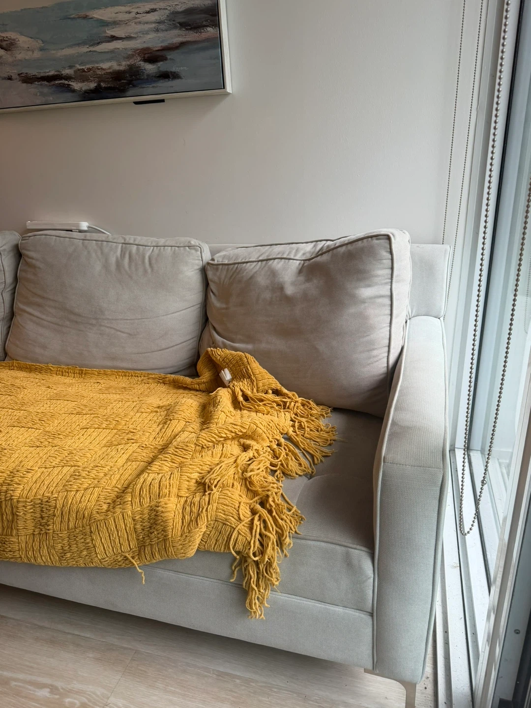 A light grey 3-seater sofa with tufted seat cushions. STRUCTUBE It's upholstered in a soft fabric and comes with three matching back cushions. A vibrant yellow knit throw blanket with fringe is included. This sofa's neutral colour makes it a versatile addition to any living space.