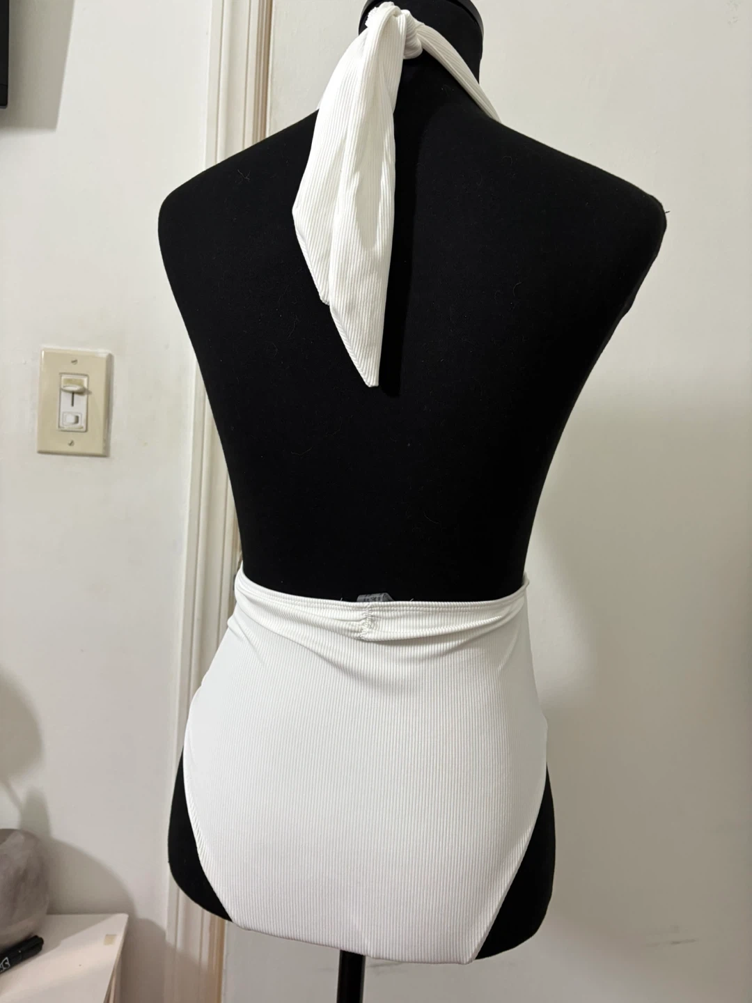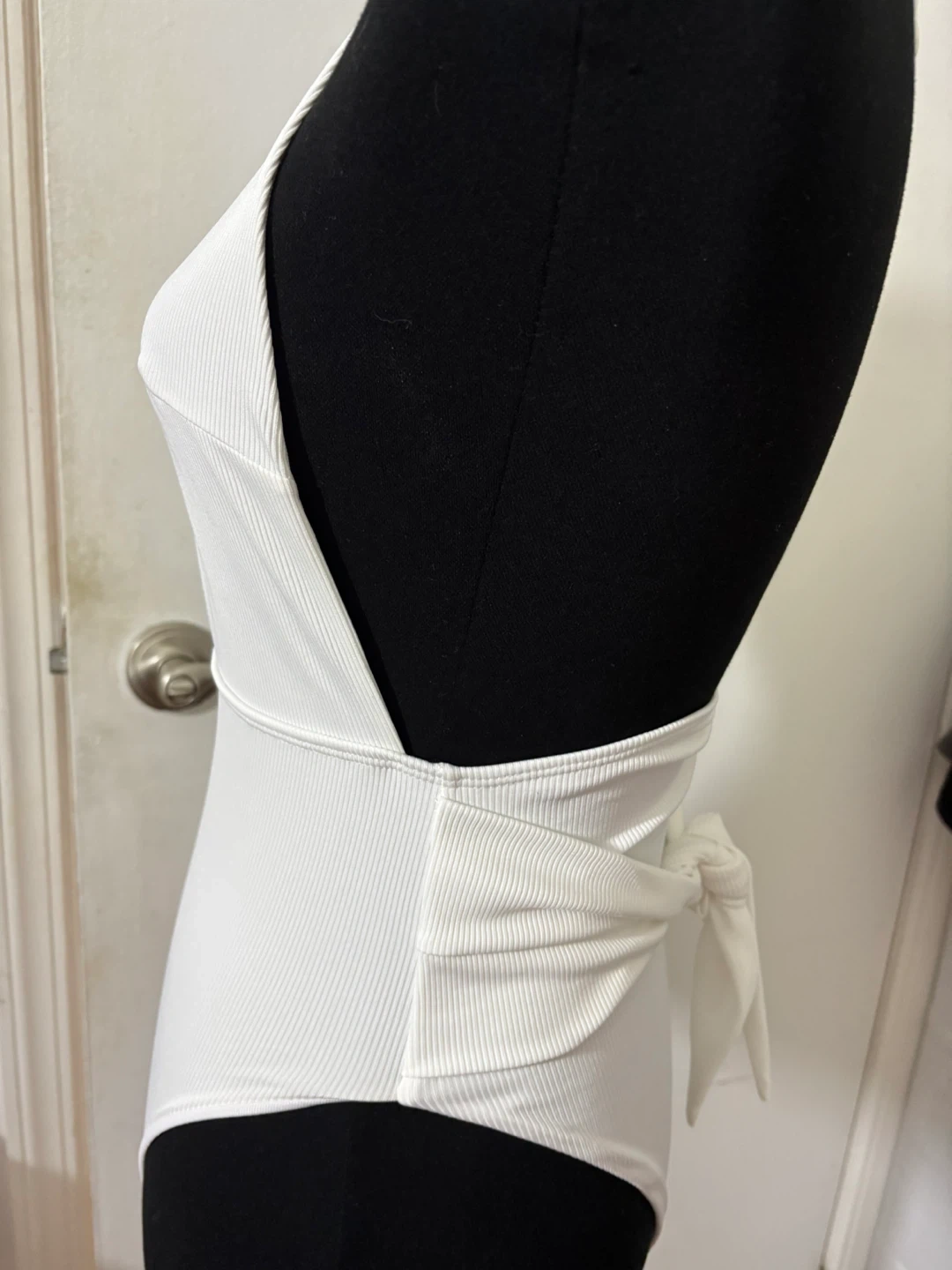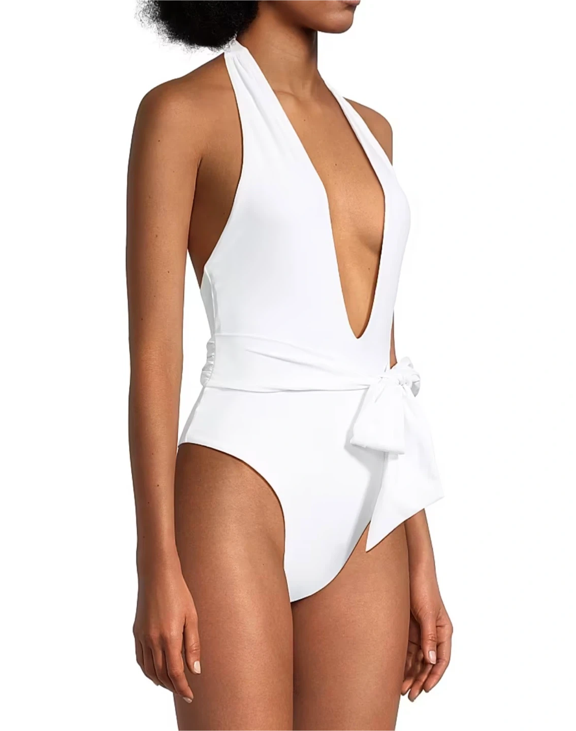 White ribbed one-piece swimsuit with a halter neck and a deep V-neckline. It features a flattering high-cut leg and a tie waist. This swimsuit is made of a stretchy, comfortable material.
