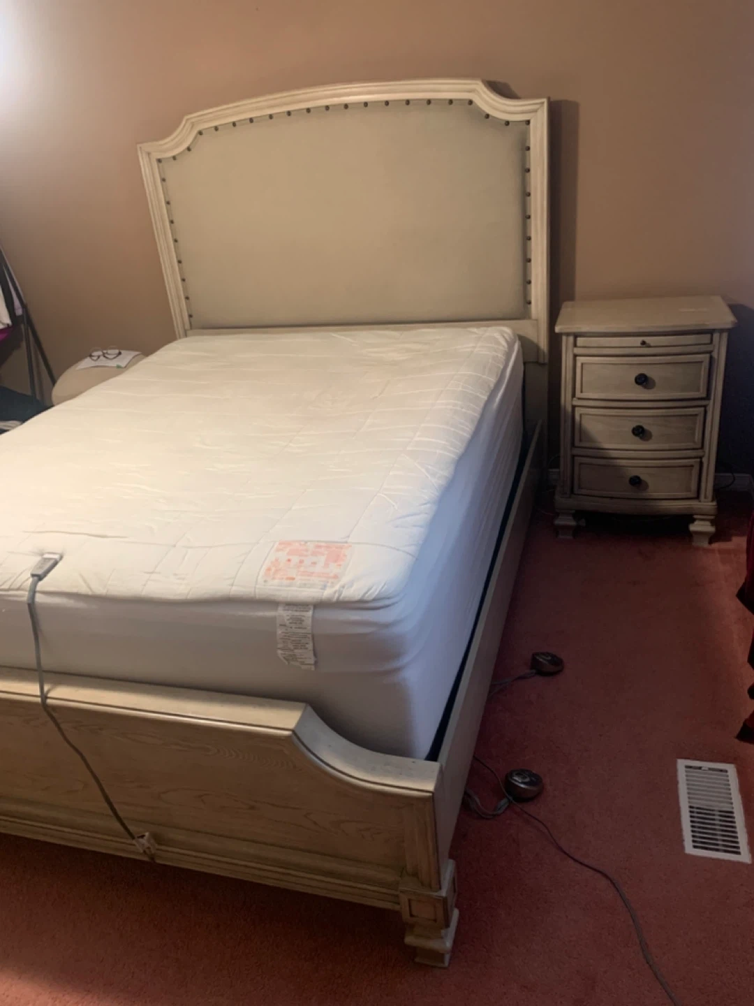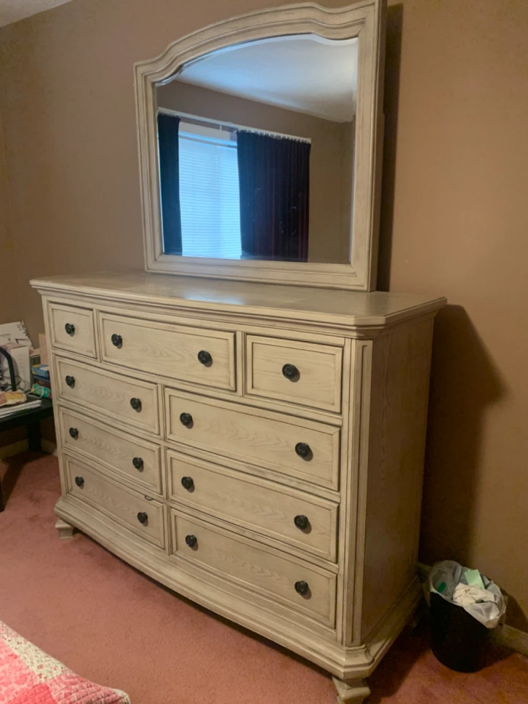 All pieces are sturdy and in overall good condition. Please note there are minor surface scratches/peeling on the top of the dresser and nightstand, but they do not affect use.