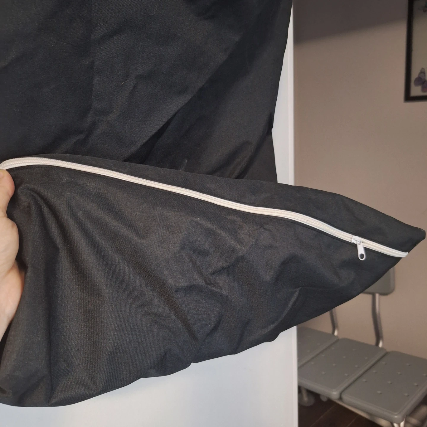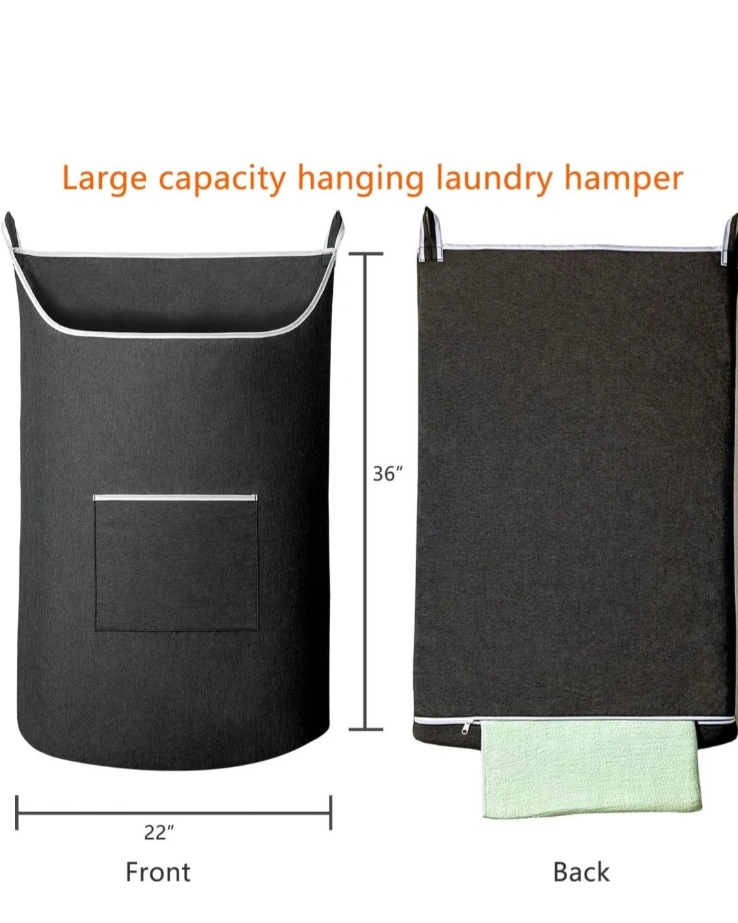 Selling a large capacity hanging laundry hamper in black. It features a wide opening design and a back bottom zip for easy access to your clothes. Perfect for bedrooms or laundry rooms!