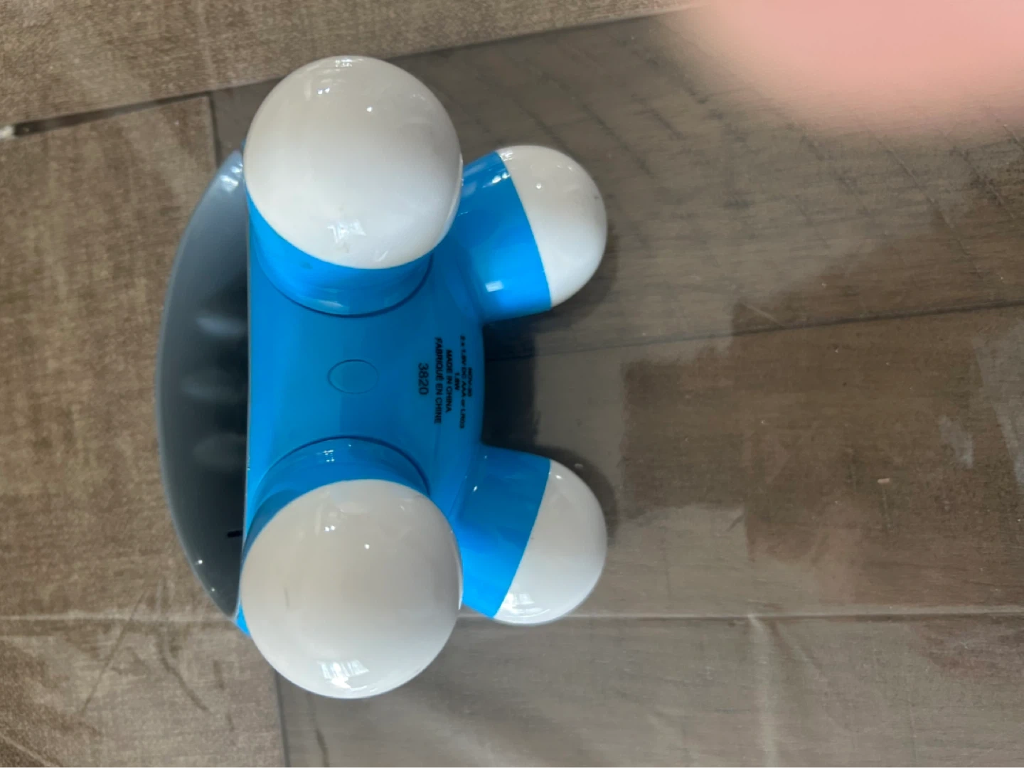 This is a blue and grey HoMedics handheld massager. It has a power button on top and four rolling massage nodes. Perfect for a quick massage on the go!