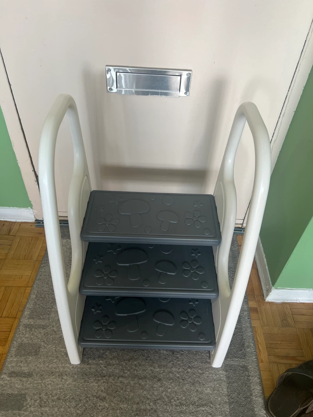 This is a 3-step stool for kids with mushroom and flower accents. It has sturdy handles for extra support. Plastic material.