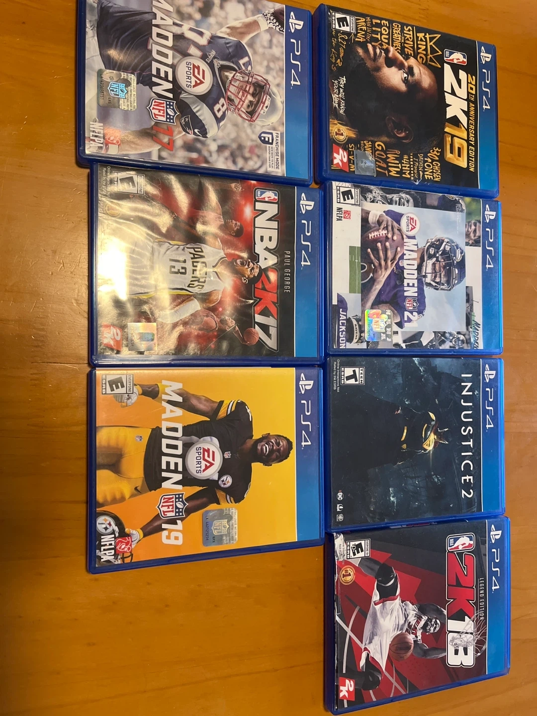 This is a bundle of various PlayStation 4 video games. Games included are Uncharted 4, Horizon Zero Dawn, Final Fantasy XII, FIFA 'XX, Marvel's Spider-Man, NBA 2K22, Madden 'XX, NBA 2K19, NBA 2K17, Madden 'XX, Madden 'XX, Injustice 2, and NBA 2K18. All are for the PS4 and PS5 platform.
