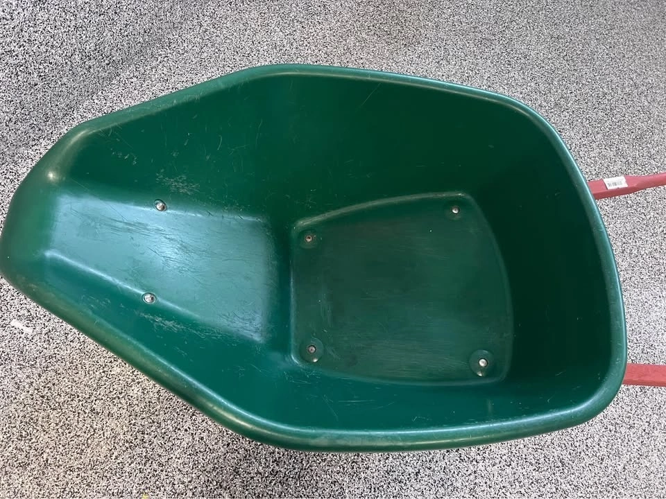 This is a 6-cubic-foot, single-wheel poly tray wheelbarrow. It's designed with a tapered spout to make unloading materials like soil, mulch, or gravel easier. We used it a few times for river rocks and soil when we were gardening at our previous home. It was very useful and dependable. We're selling it because we no longer need it at our current place. Great opportunity for someone who could use it!