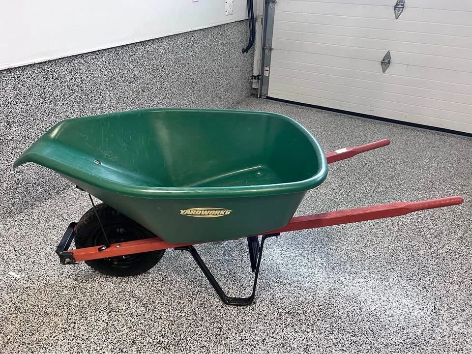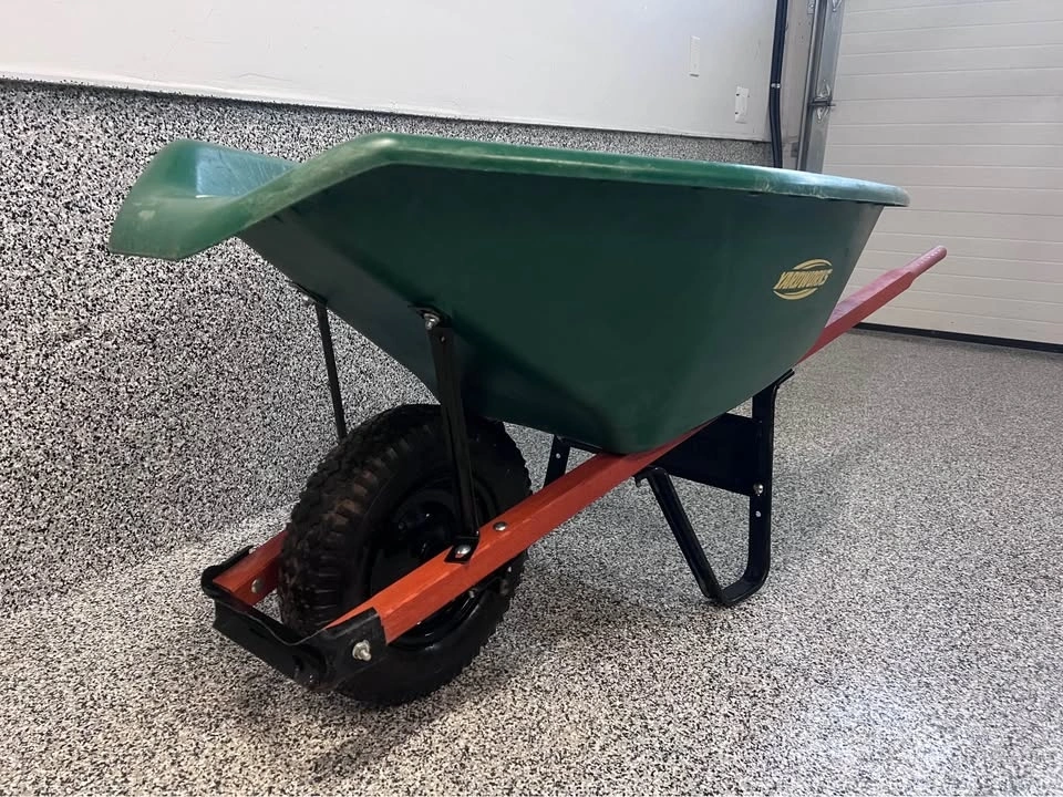 This is a 6-cubic-foot, single-wheel poly tray wheelbarrow. It's designed with a tapered spout to make unloading materials like soil, mulch, or gravel easier. We used it a few times for river rocks and soil when we were gardening at our previous home. It was very useful and dependable. We're selling it because we no longer need it at our current place. Great opportunity for someone who could use it!