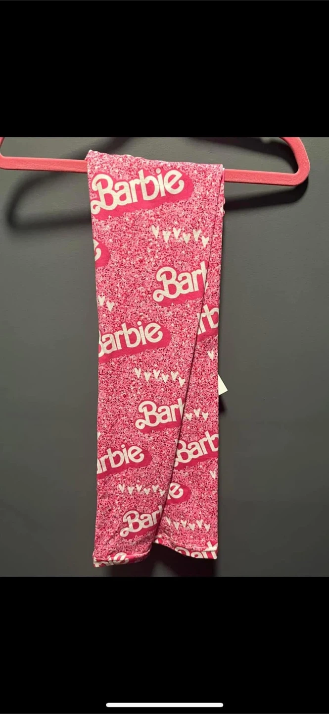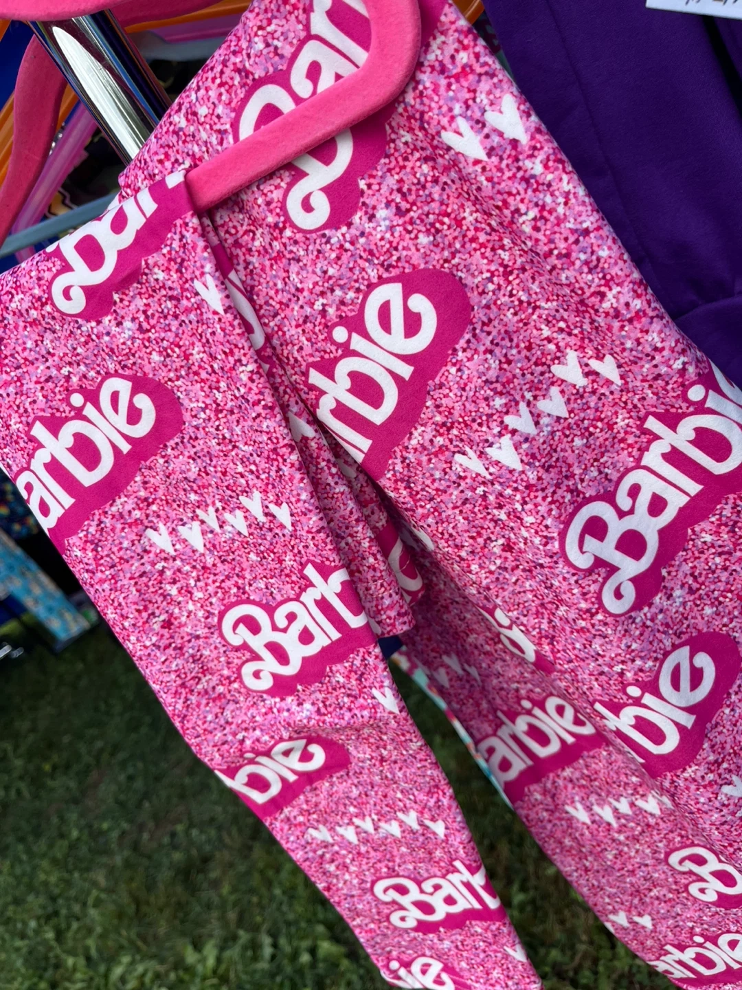 These vibrant pink yoga pants feature a repeating Barbie logo pattern with a subtle sparkle effect. They're made for comfort with a double elastic yoga waistband. The pants offer a fun, playful look for kids or tweens.
