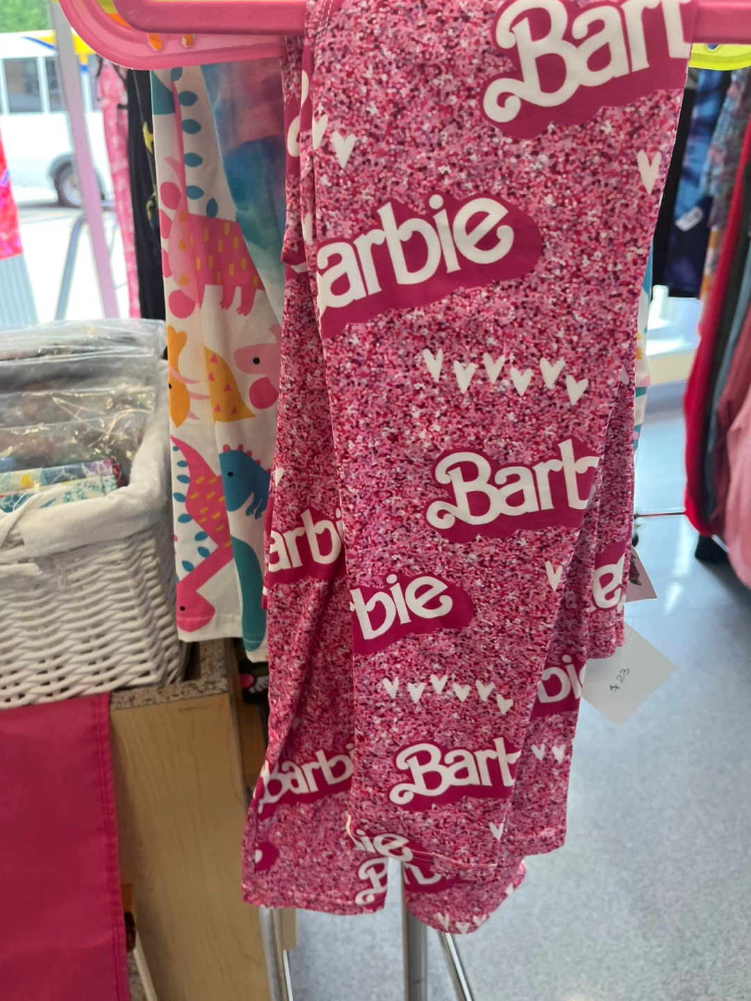 These vibrant pink yoga pants feature a repeating Barbie logo pattern with a subtle sparkle effect. They're made for comfort with a double elastic yoga waistband. The pants offer a fun, playful look for kids or tweens.
