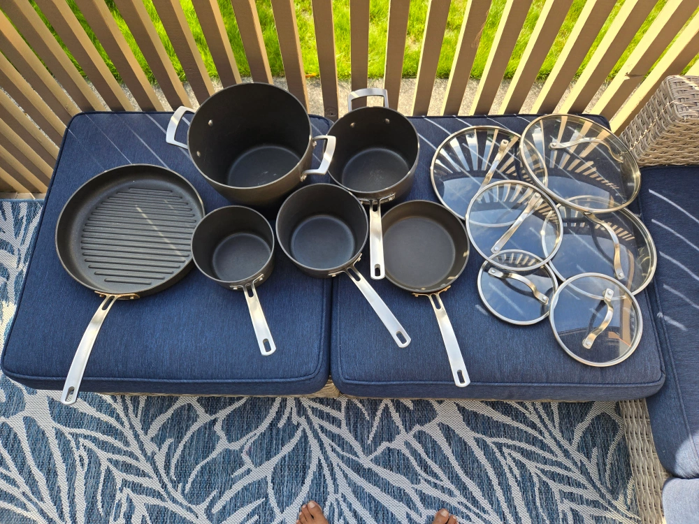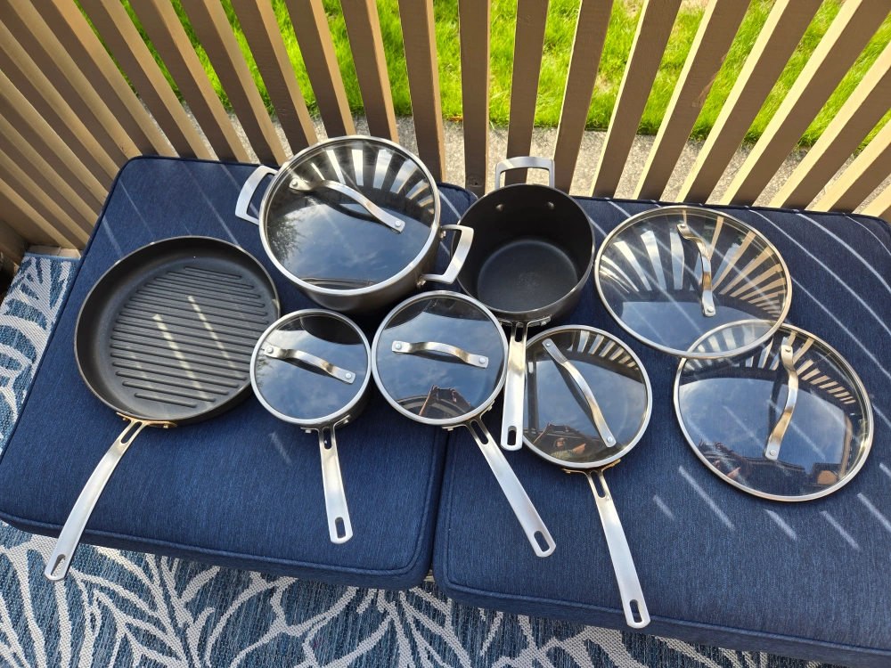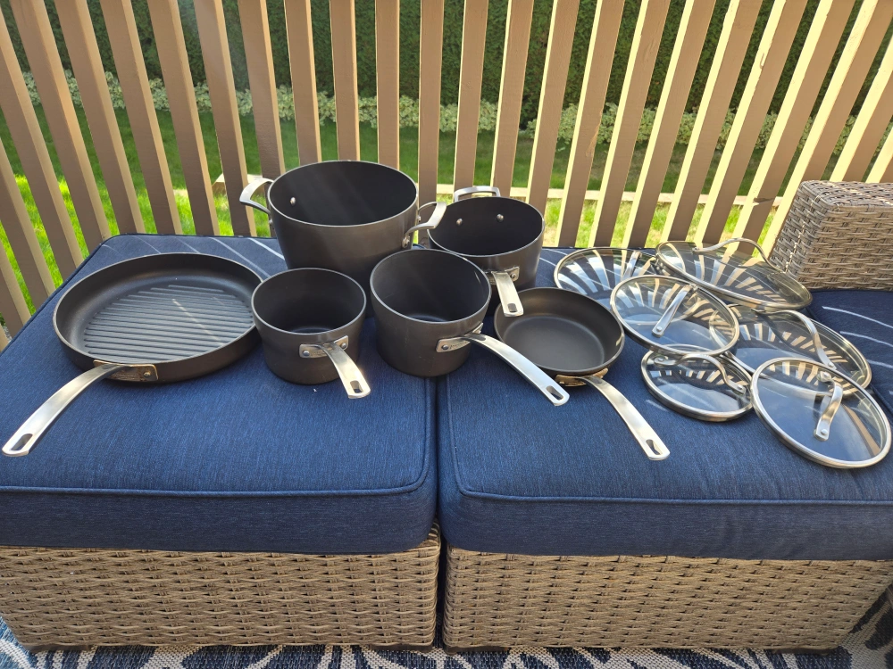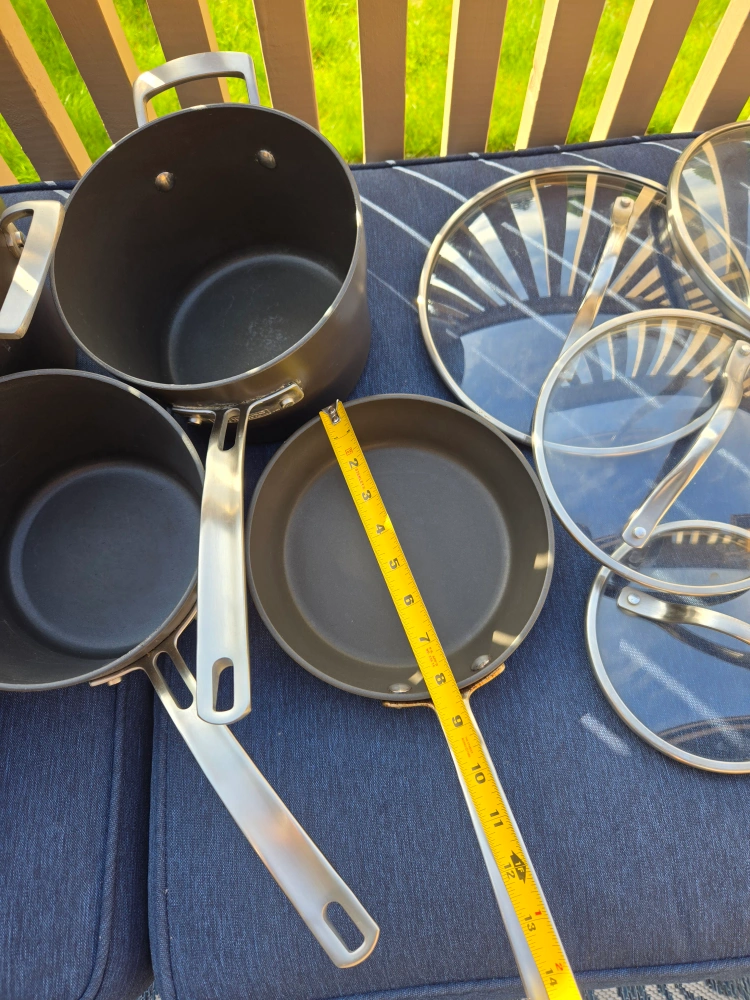 Selling a Kirkland non stick cookware set, which includes 12 pieces. This set includes various pots, pans. 5 pots have matching lids. There are 2 extra lids.