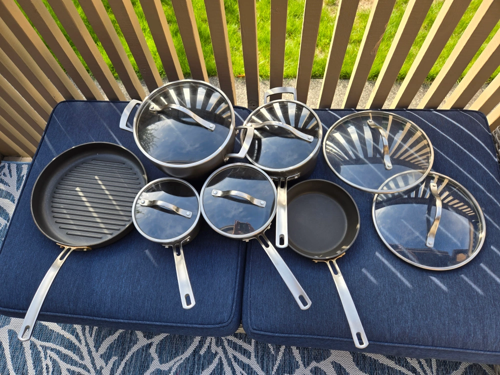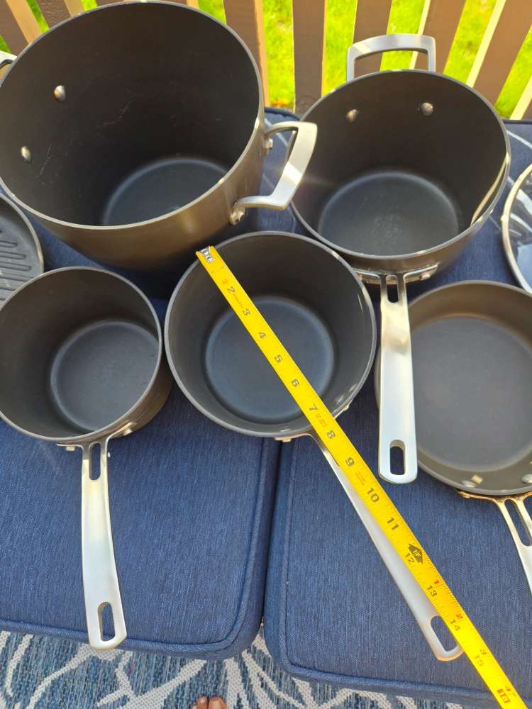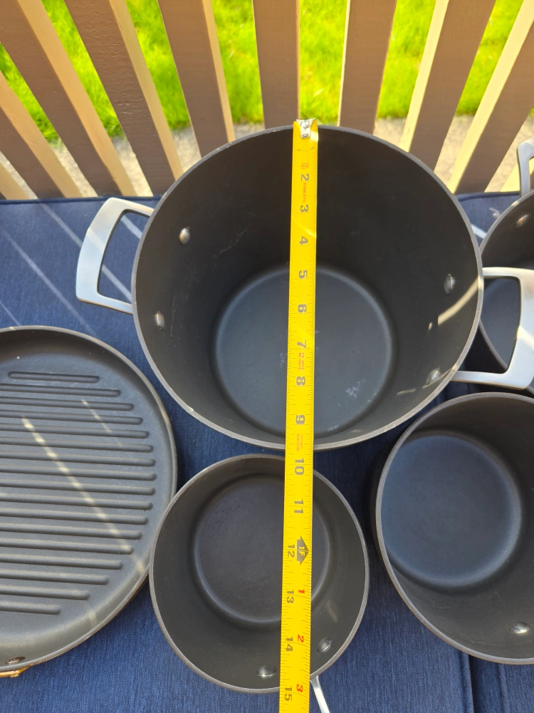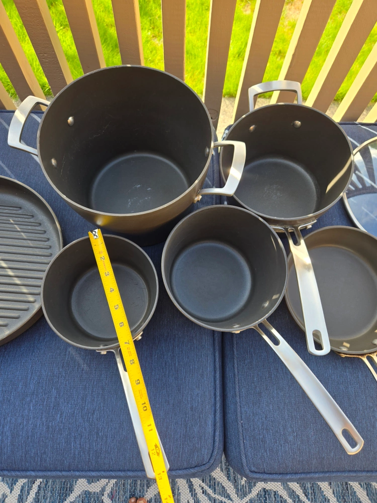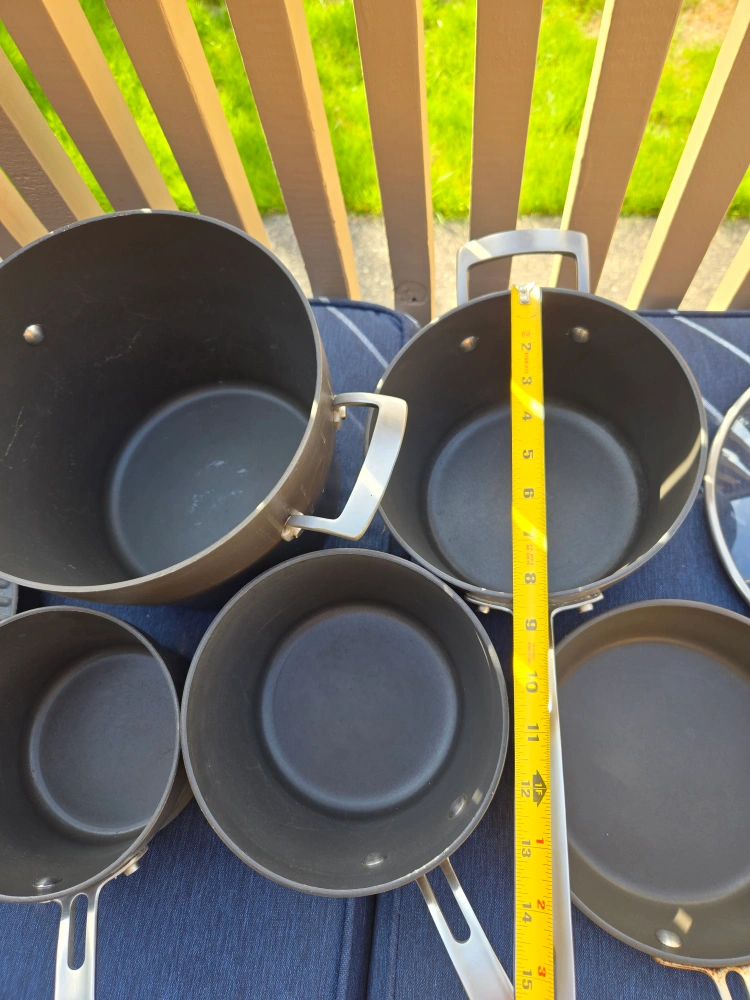 Selling a Kirkland non stick cookware set, which includes 12 pieces. This set includes various pots, pans. 5 pots have matching lids. There are 2 extra lids.
