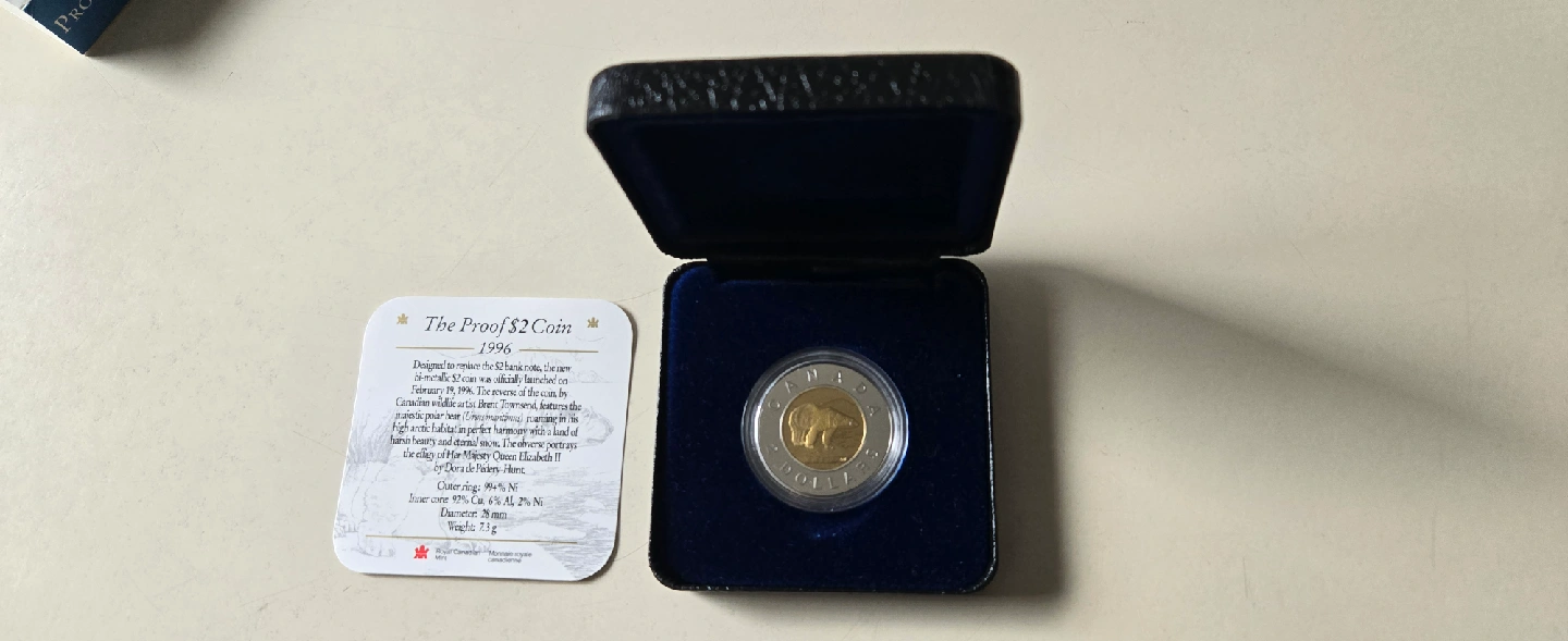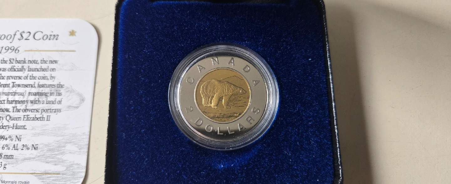 Selling a 1996 proof $2 coin featuring the polar bear design! It comes in its original box. This toonie was designed to resemble the $2 bank note and was officially launched on February 19, 1996. The reverse of the coin features a polar bear roaming in his northern harmony with a land of ice and snow. The obverse portrays Queen Elizabeth II. The coin is made of 94% Ni, outer ring: 86% Ni, inner core: 92% Cu, 6% Al, 2% Ni. Diameter: 28mm. Weight: 7.3g