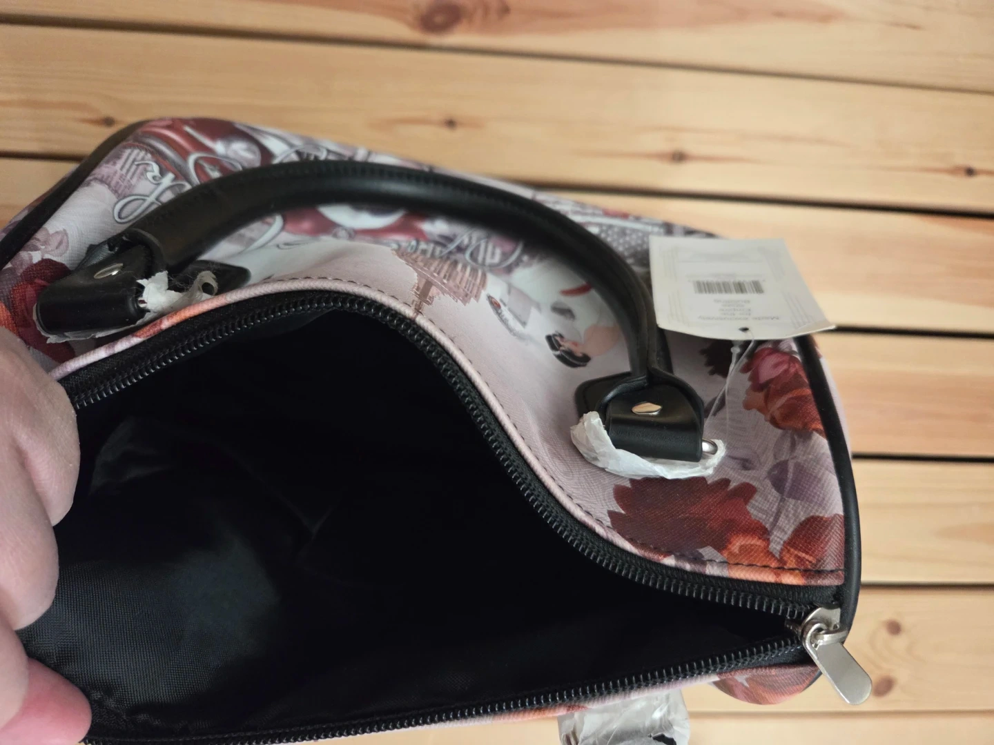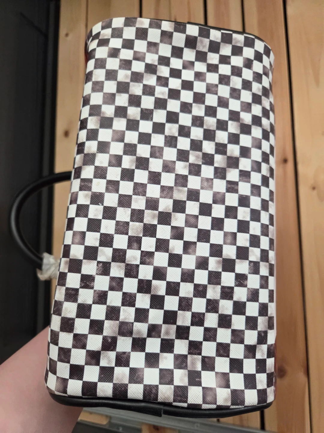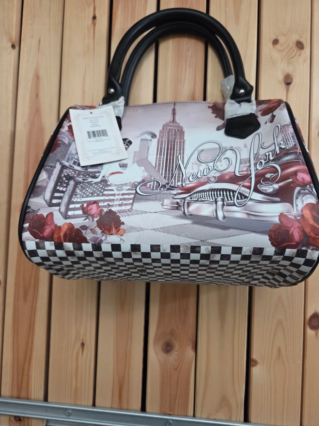 A stylish satchel bag with a New York cityscape and classic car print. It features a checkered bottom and black faux leather handles. This bag is perfect for adding a retro flair to your outfit!