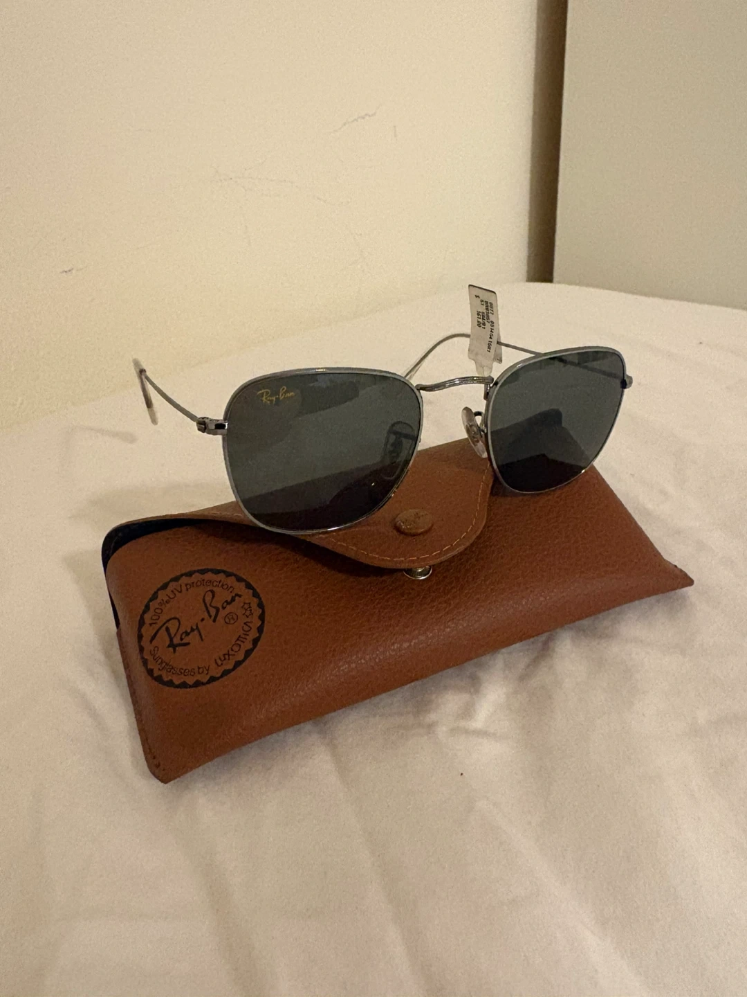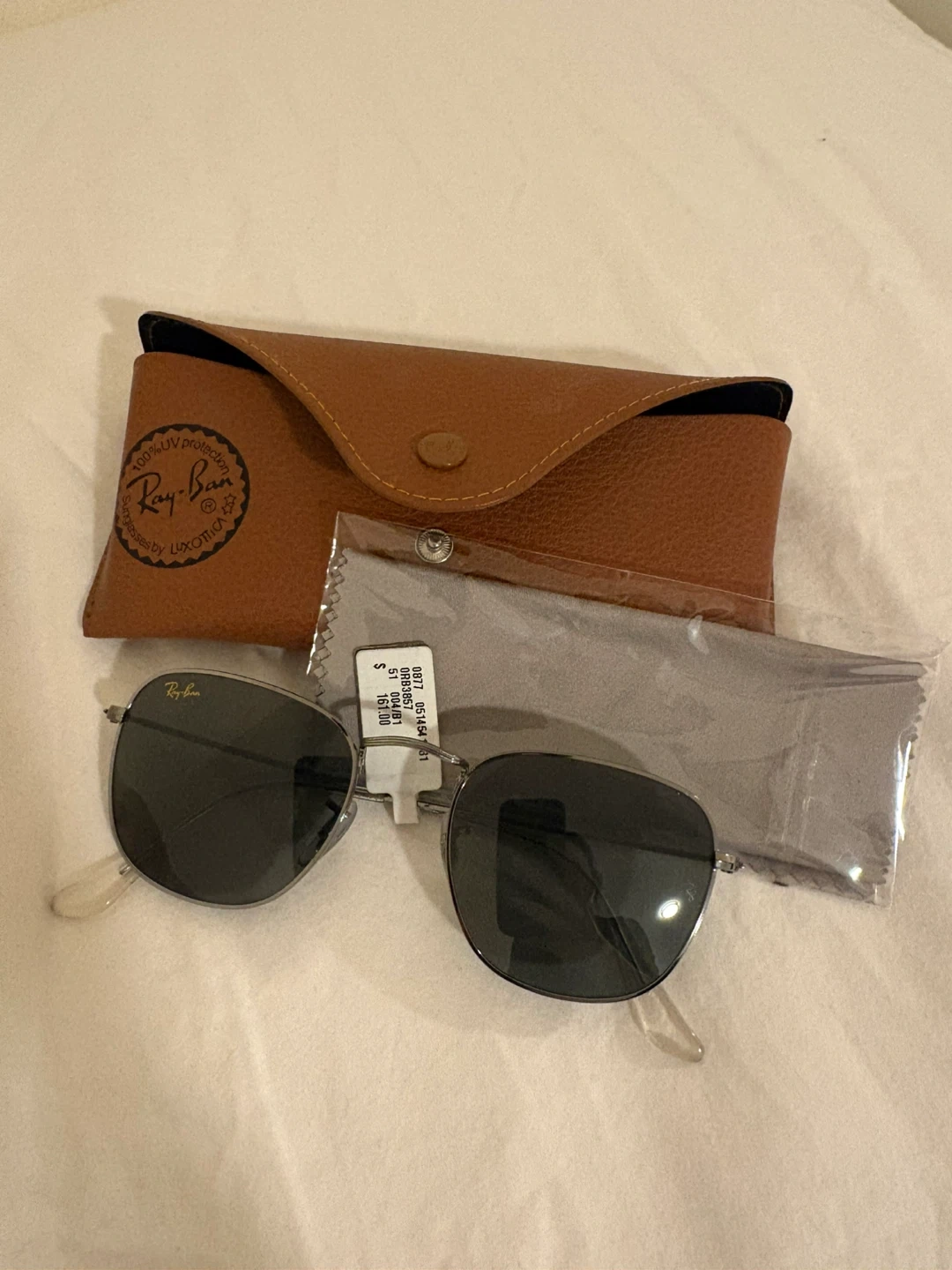 Ray-Ban sunglasses with 100% UV protection. Includes a brown leather case and cleaning cloth.