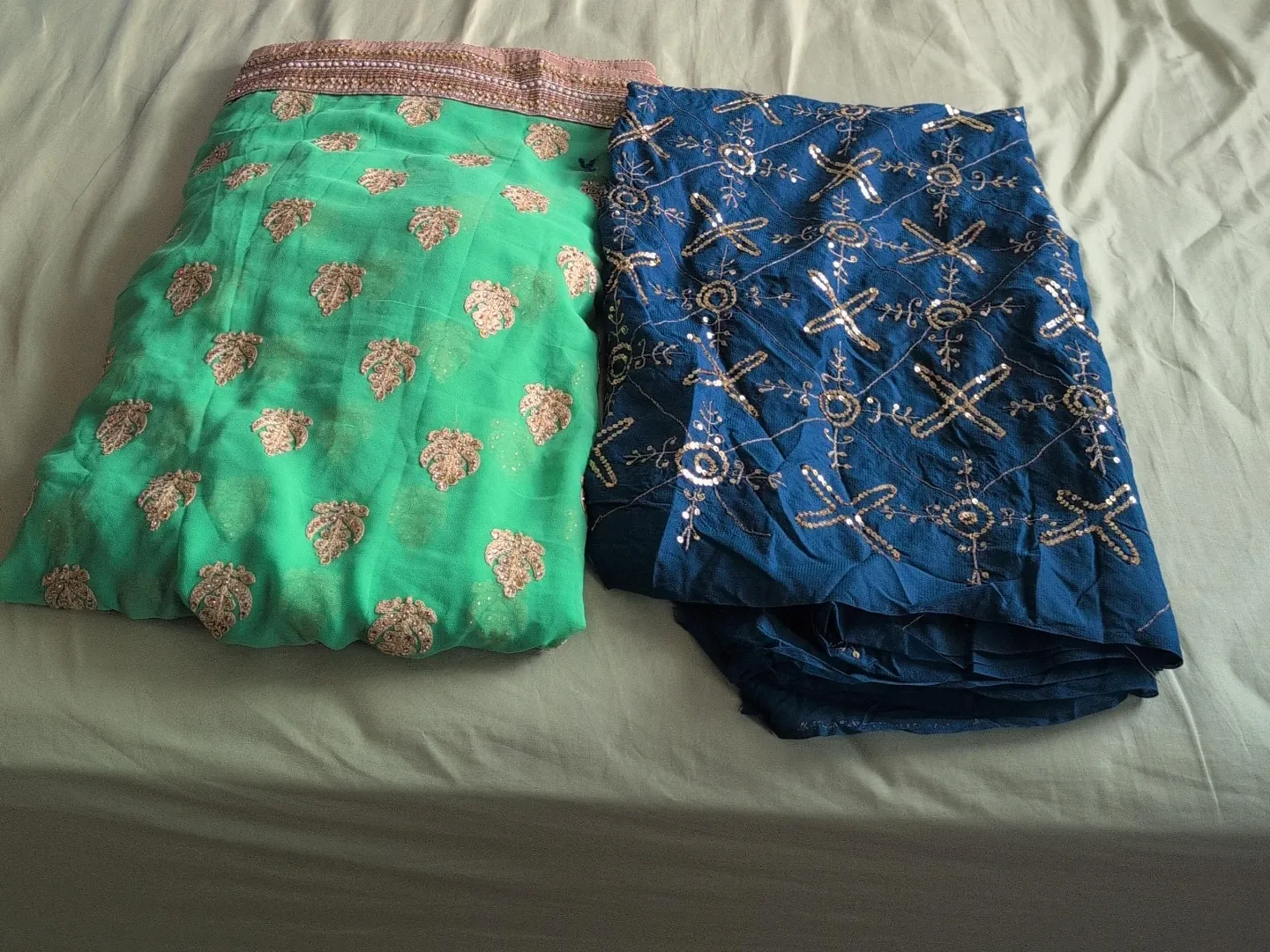 Two-piece embroidered Indian saree set. One in a vibrant green with gold leaf patterns, and the other in a deep blue with intricate gold and sequin designs. Both pieces feature detailed sequin and thread work.