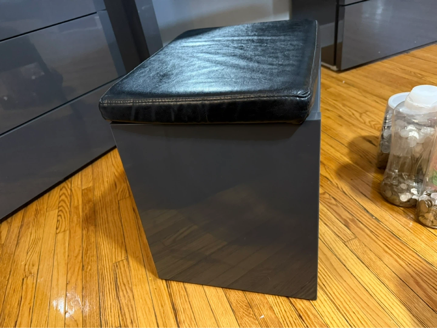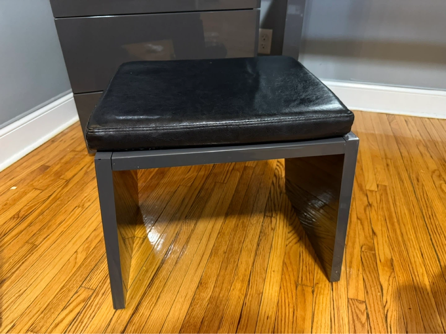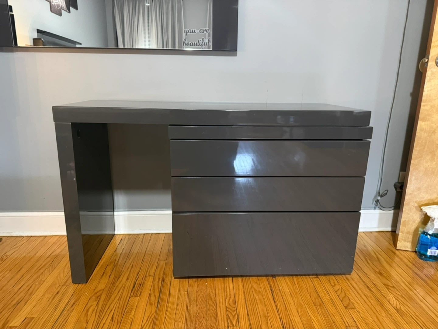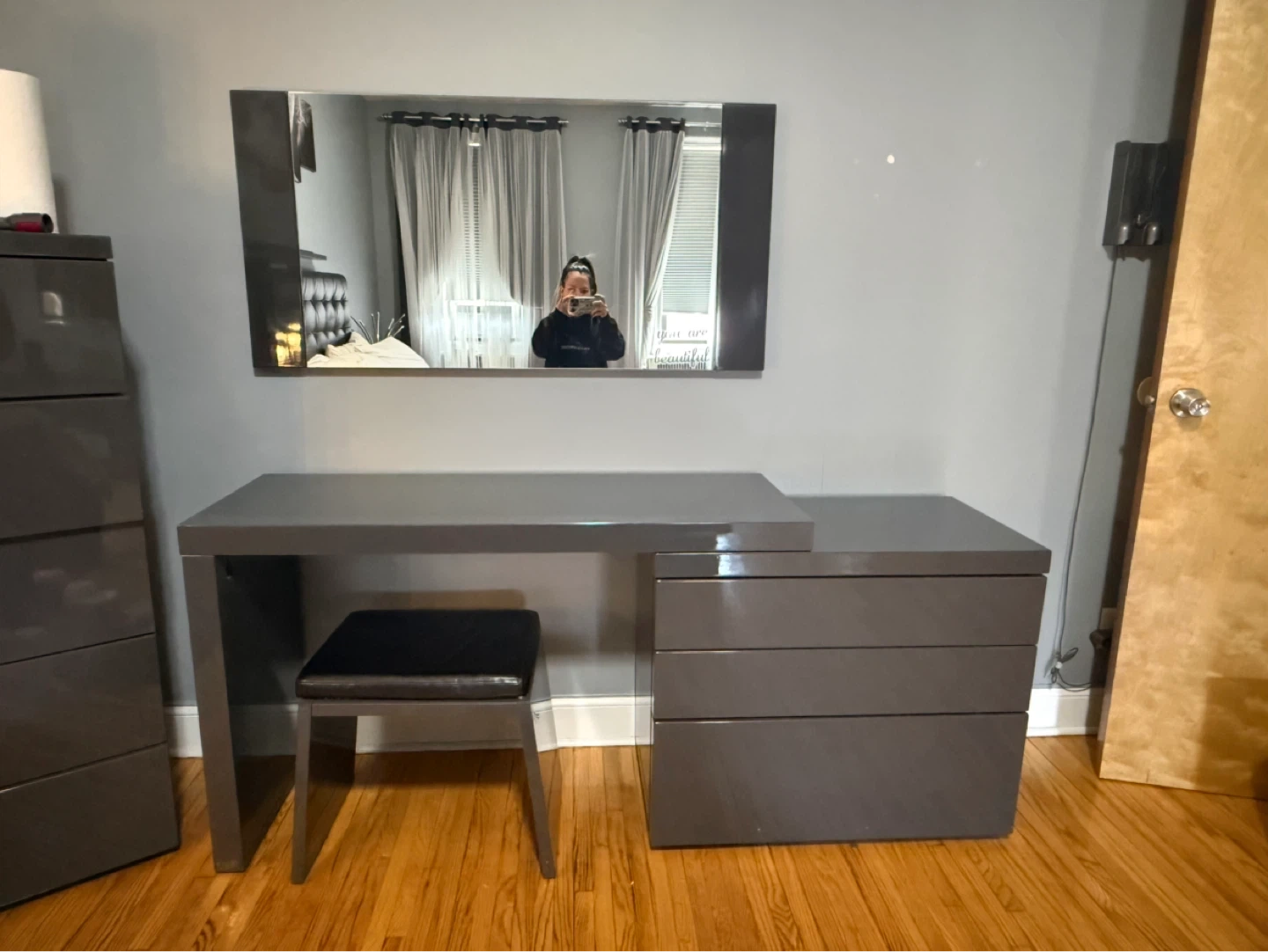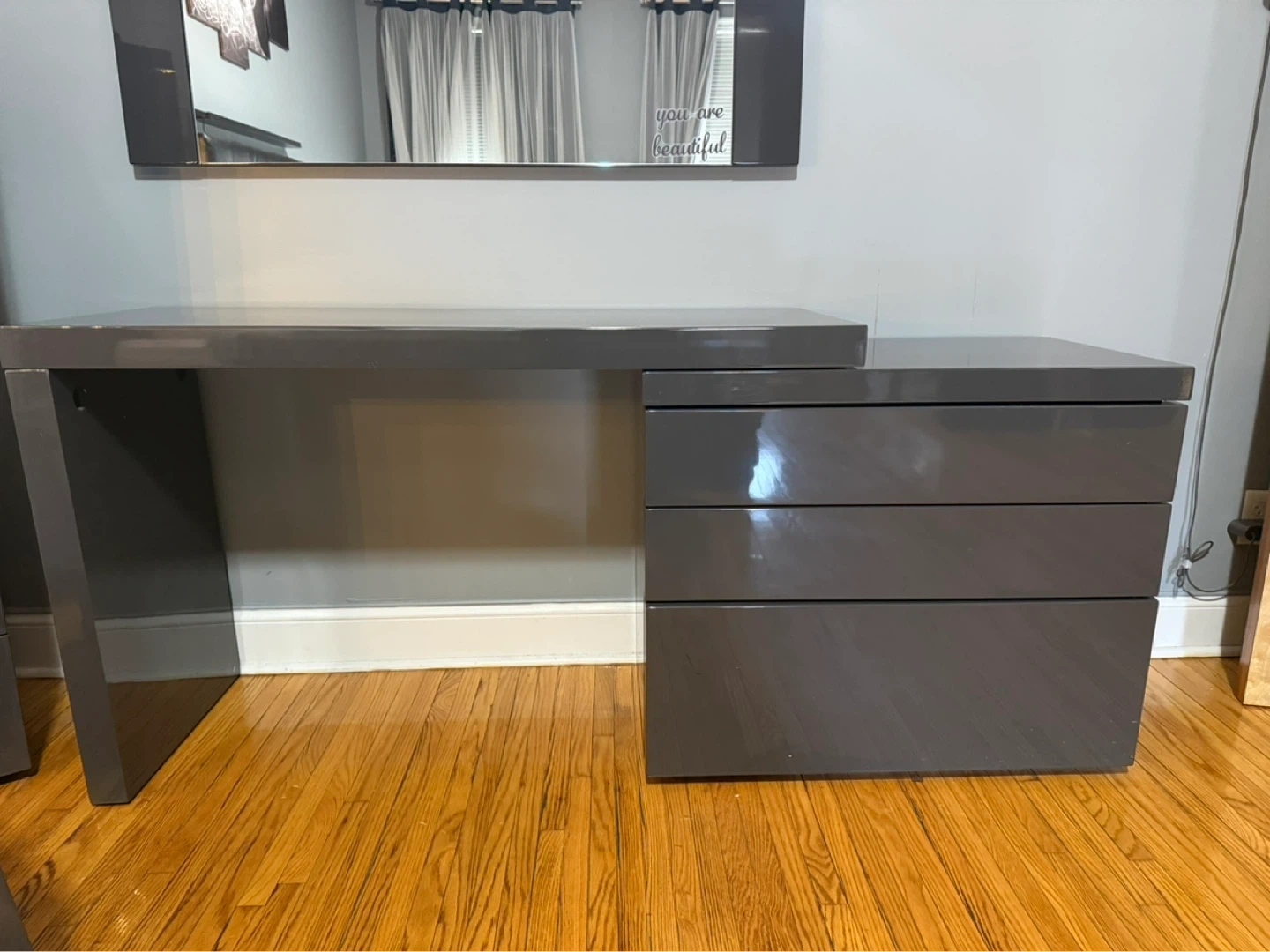 Grey vanity desk with a built-in three-drawer dresser and a matching stool. The surface has a glossy finish. It comes with a large rectangular mirror that mounts above the desk.