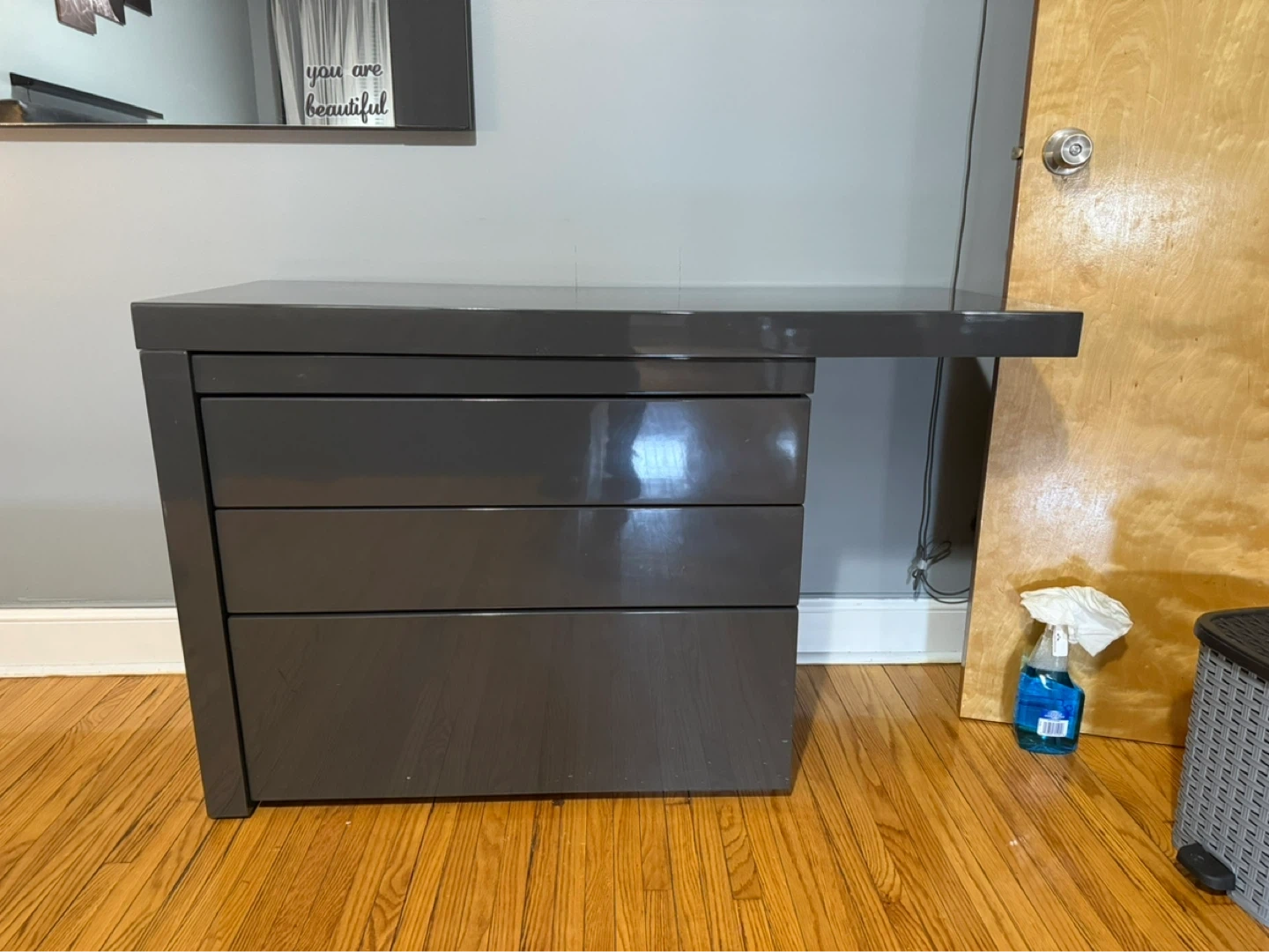 Grey vanity desk with a built-in three-drawer dresser and a matching stool. The surface has a glossy finish. It comes with a large rectangular mirror that mounts above the desk.