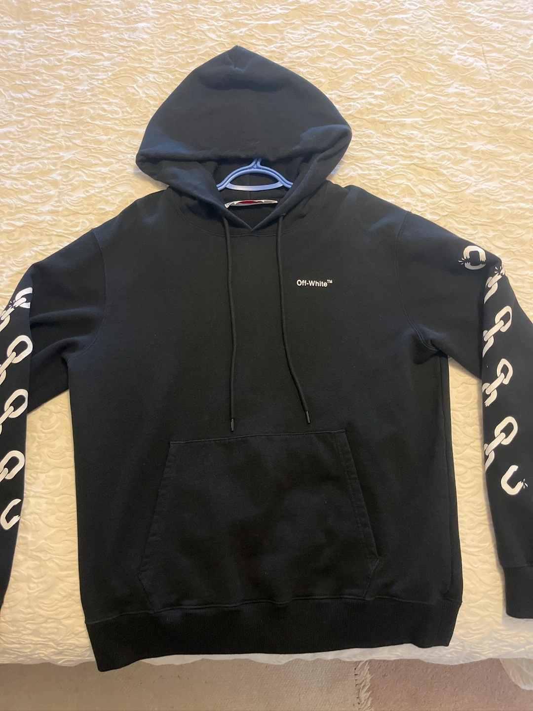 Selling a black Off-White hoodie with the chain link design on the sleeves and back. It's in great condition and ready for a new owner! Perfect for adding a touch of streetwear to your wardrobe