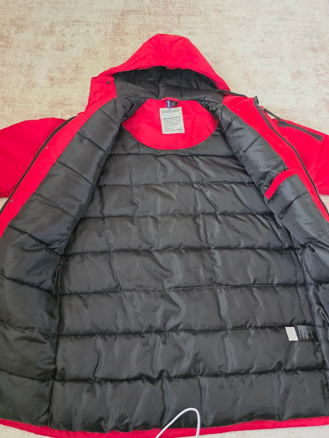 This is a red parka jacket with a black quilted lining. It has a hood and multiple exterior pockets. It's a warm jacket for colder weather.
