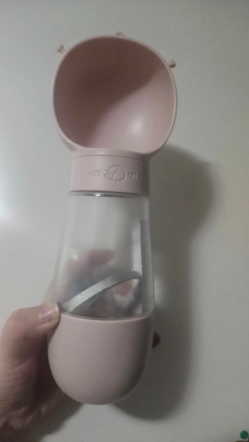 This is a pink portable pet water bottle. It has an integrated bowl for easy drinking and a lock to prevent leaks. This bottle is great for walks or travel with your furry friend!