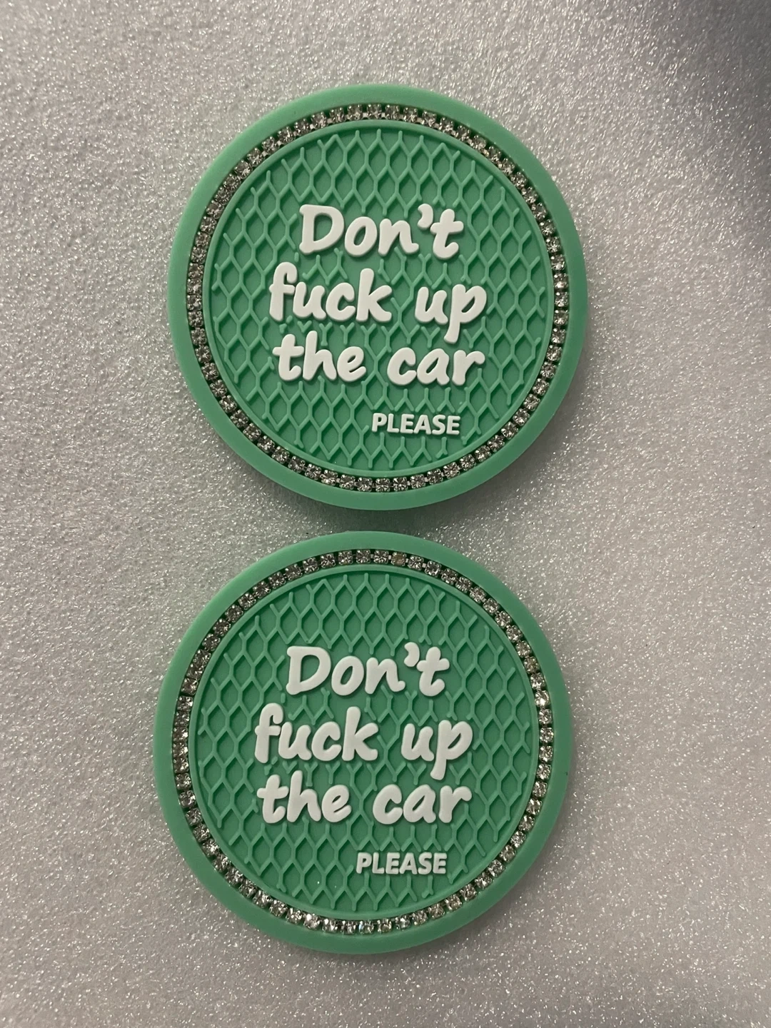 Set of two green car coasters with diamond trim and 'Don't fuck up the car' text. Measures 2.76 inches in diameter. Made of silicone material.