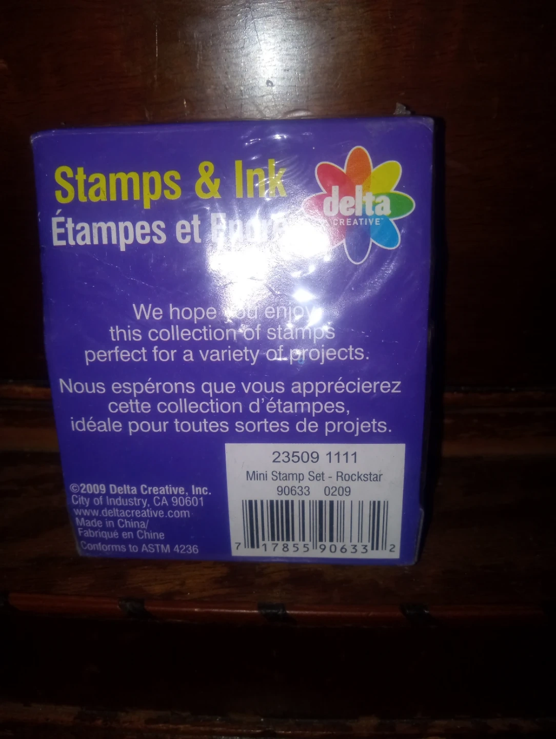 This set includes 3 wood stamps and ink. The stamps have designs like a guitar and 'Party Like A Rockstar' text. It's suitable for ages 6 and up. Great for craft projects!