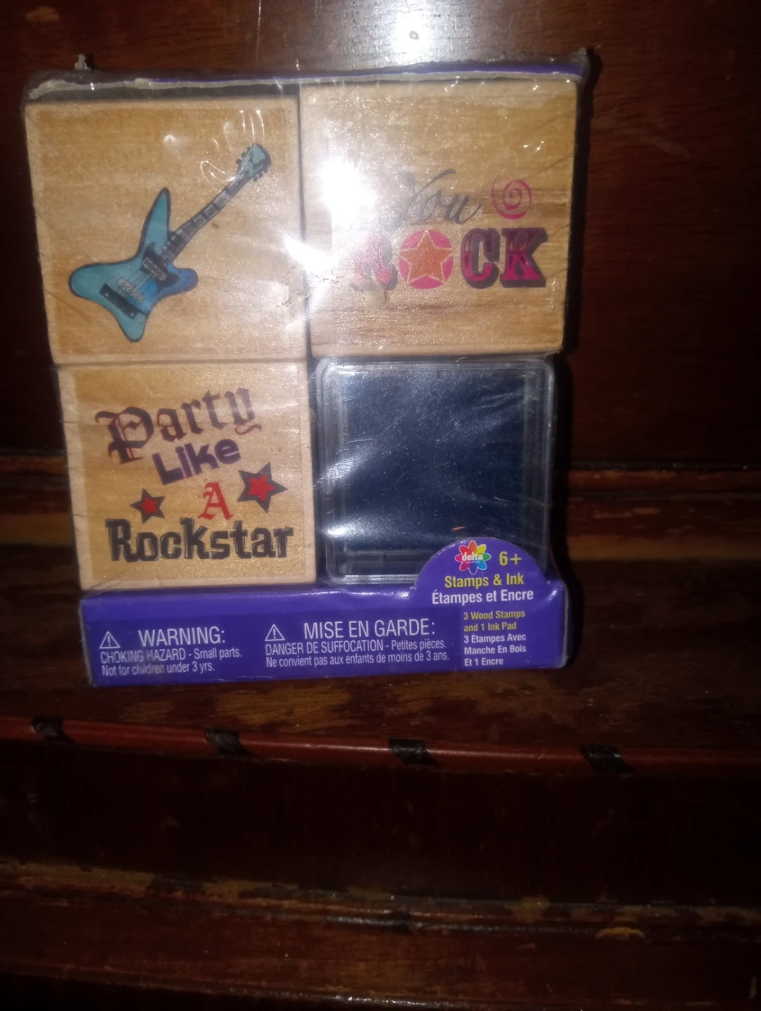 This set includes 3 wood stamps and ink. The stamps have designs like a guitar and 'Party Like A Rockstar' text. It's suitable for ages 6 and up. Great for craft projects!
