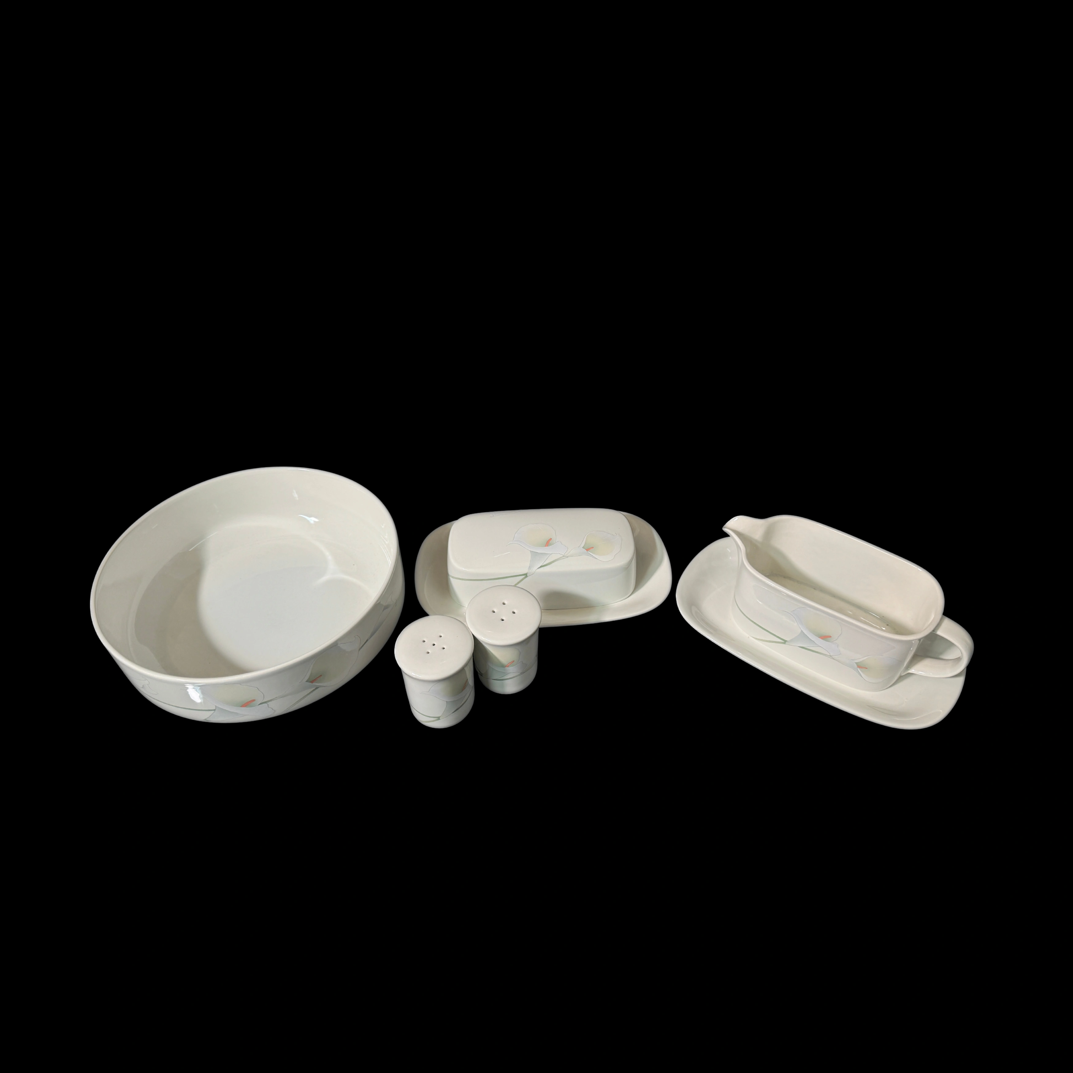 Selling a vintage Mikasa Whole Wheat Calla Lily set! This beautiful set includes a serving bowl, butter dish, salt and pepper shakers, and a gravy boat with a saucer. Perfect for adding a touch of elegance to your dining table