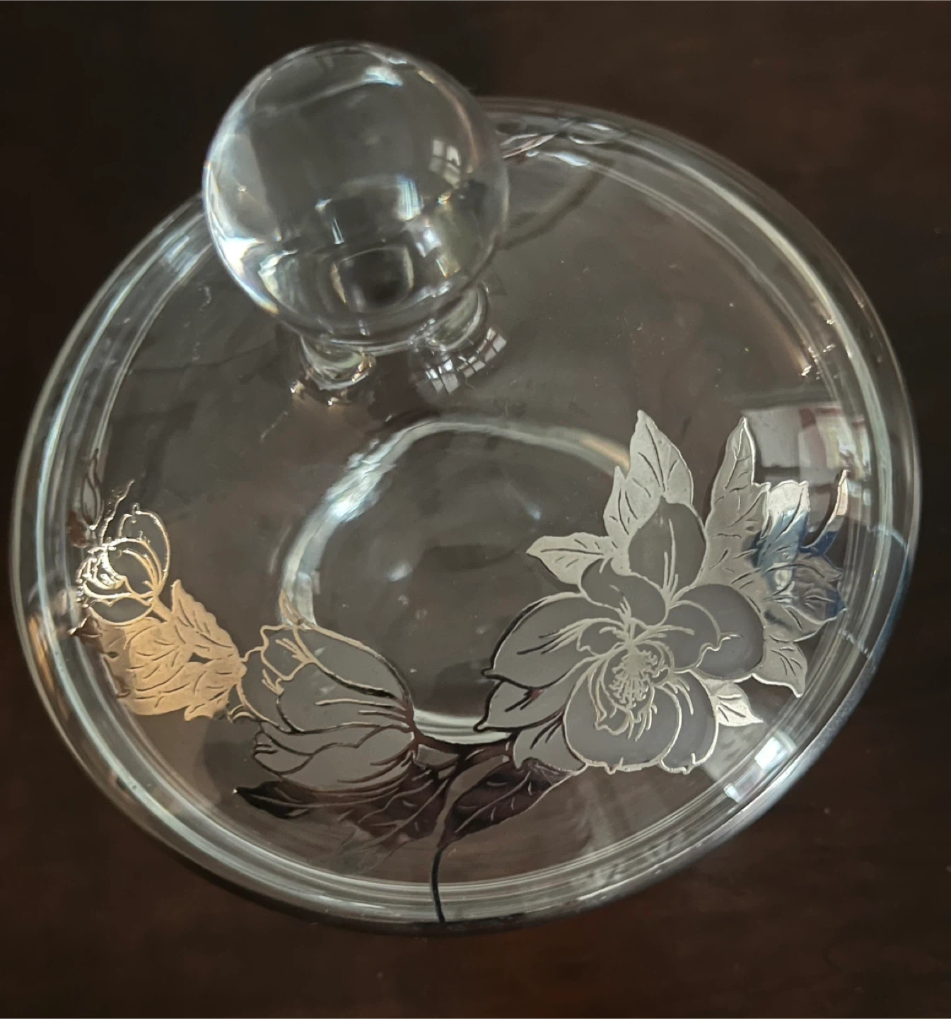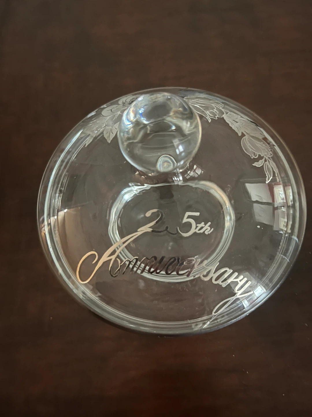 Glass candy dish and lid set. Features etched floral designs and "25th Anniversary" text. It's perfect for serving treats or as a decorative piece.