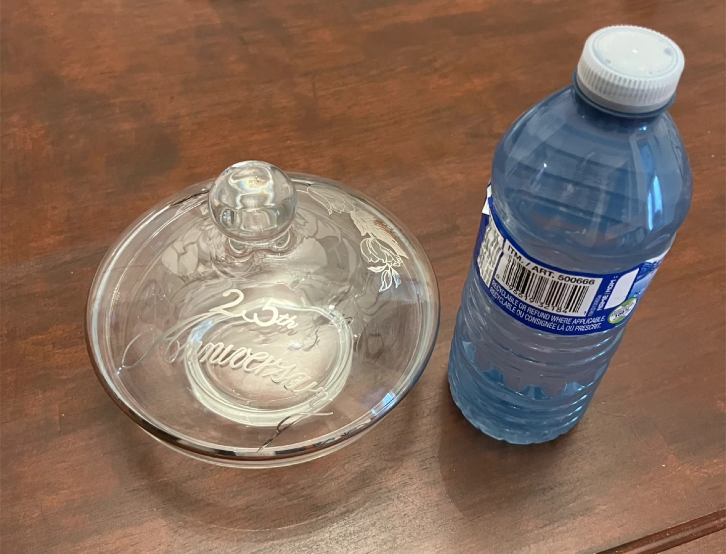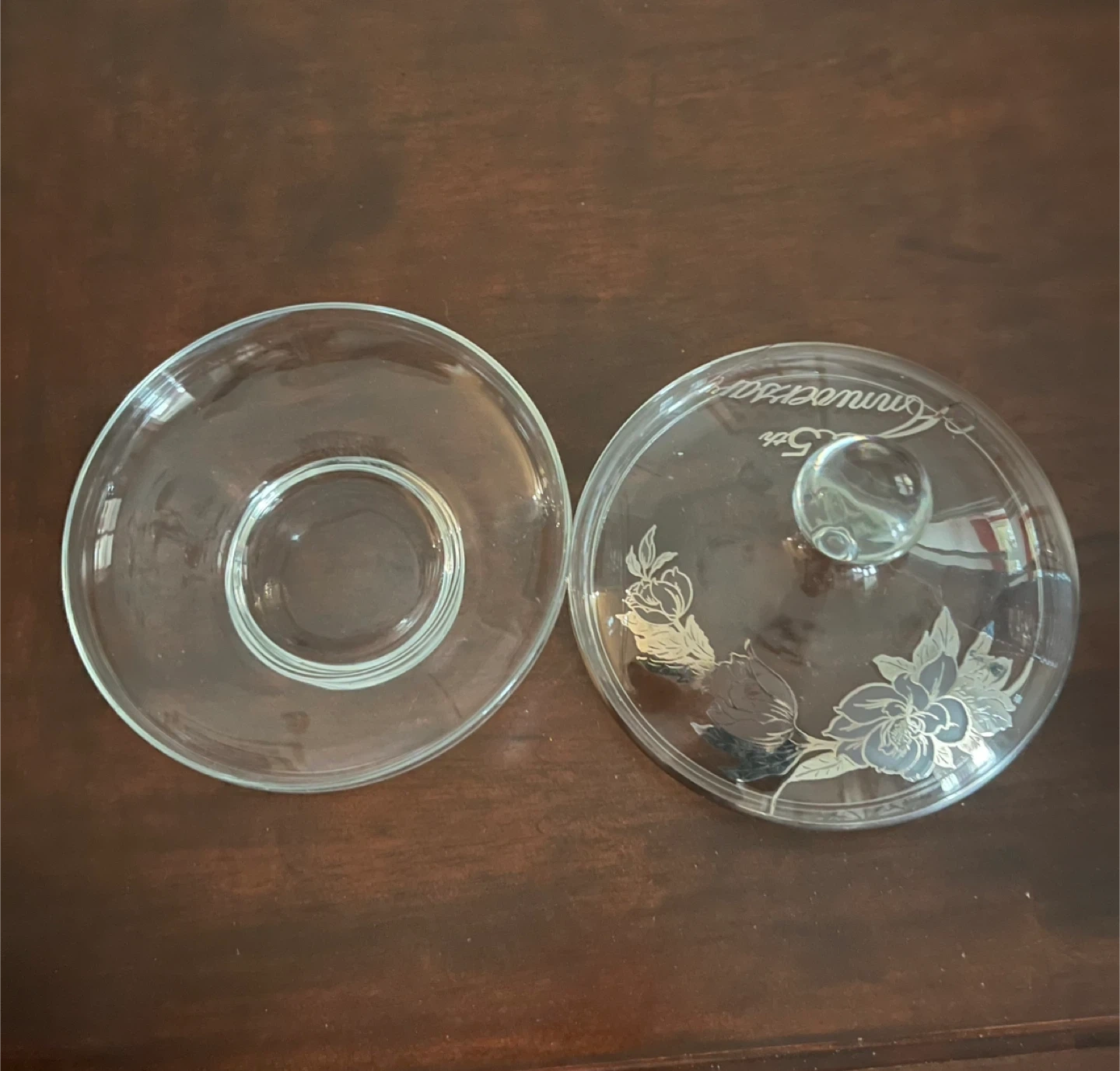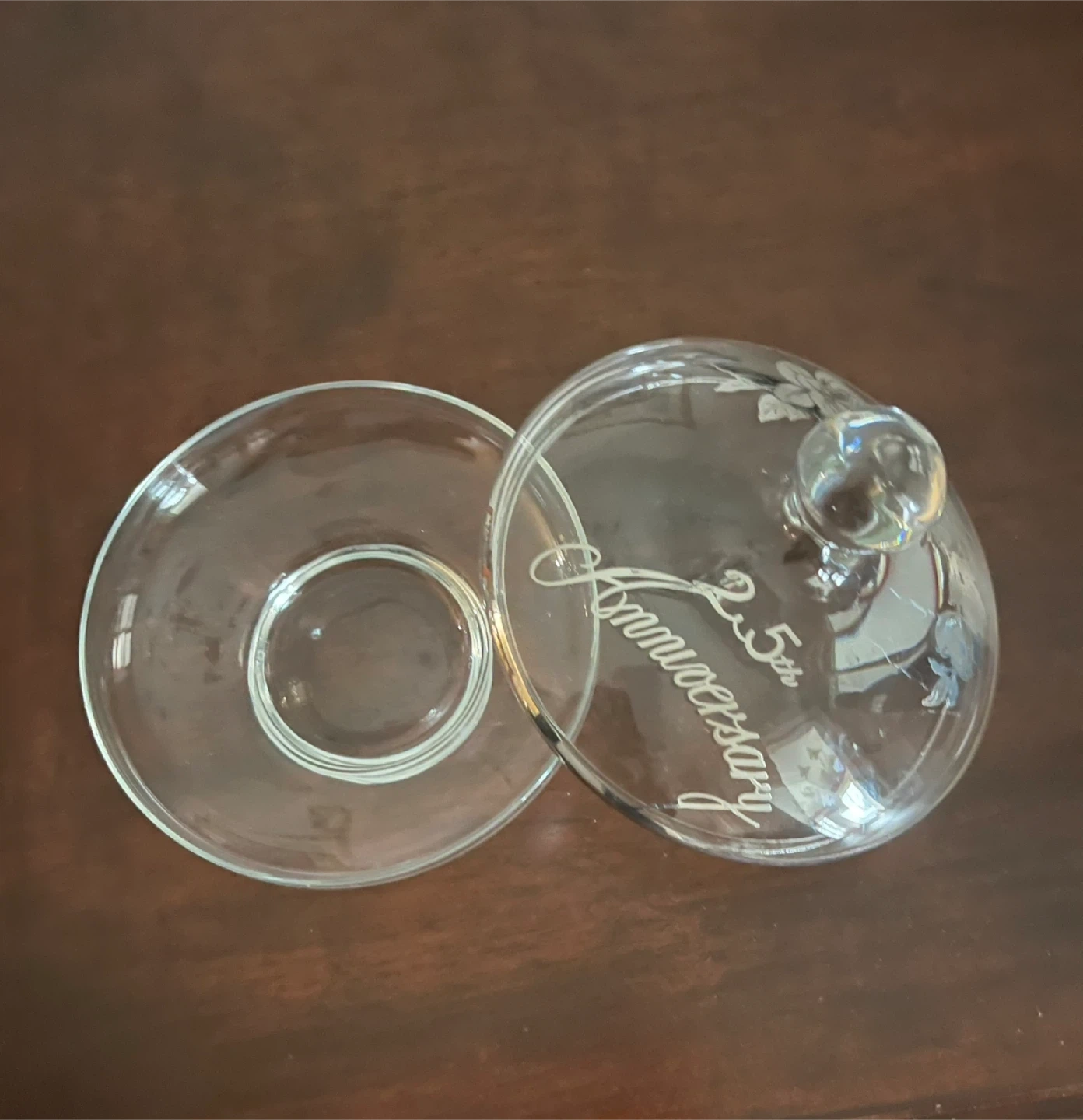 Glass candy dish and lid set. Features etched floral designs and "25th Anniversary" text. It's perfect for serving treats or as a decorative piece.