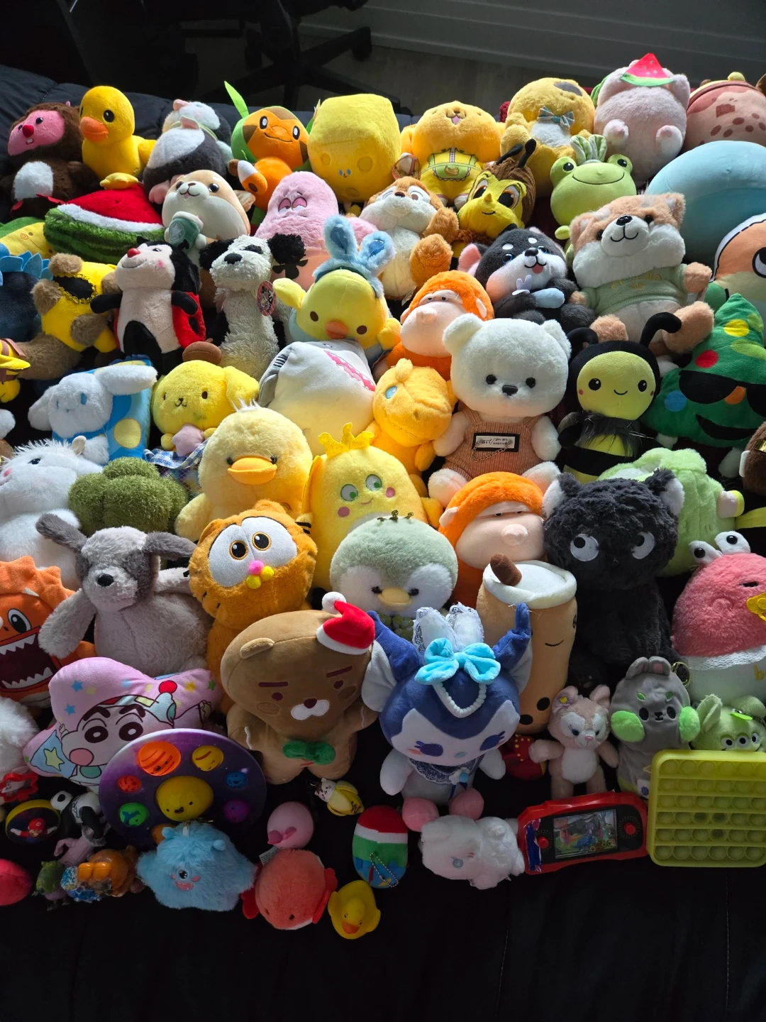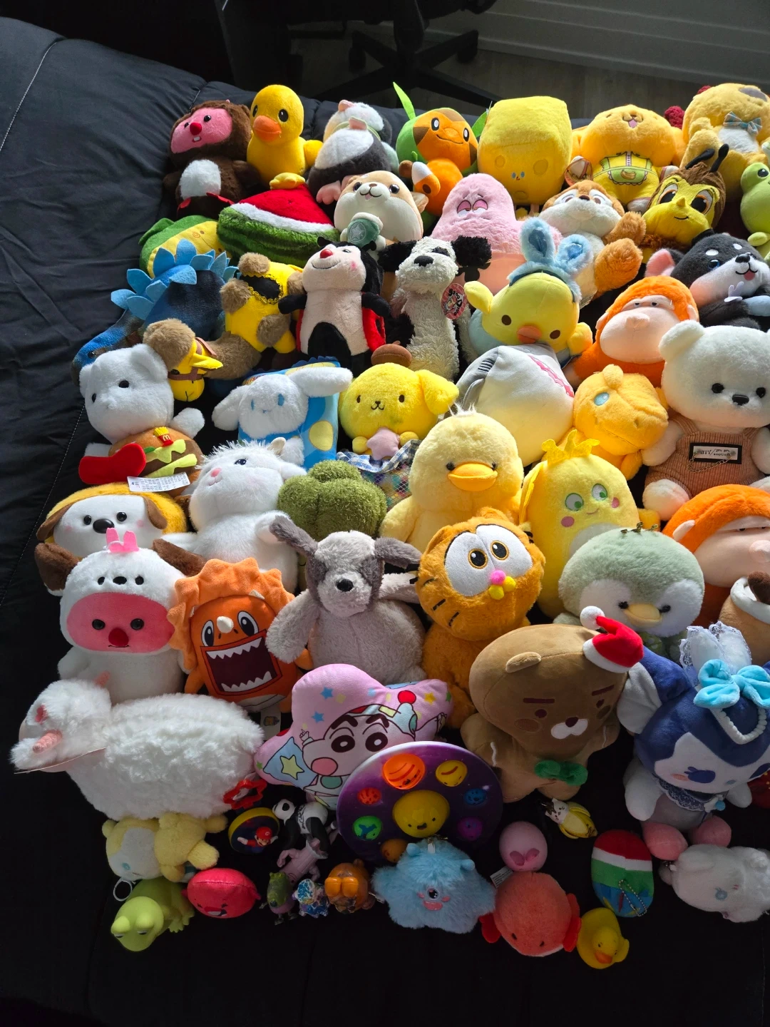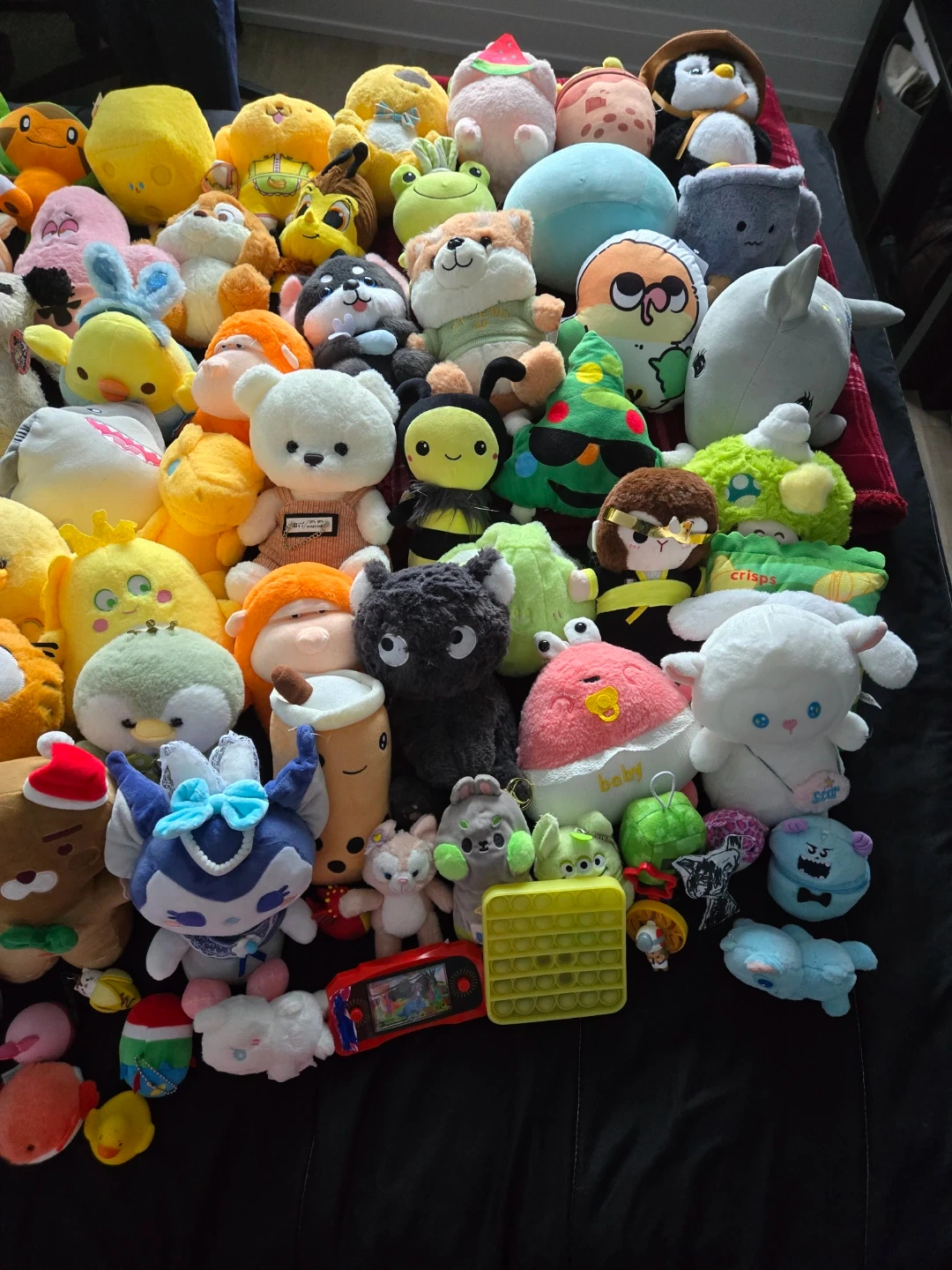 A collection of various plush toys featuring different characters and animals. Many are soft and cuddly. They're great for decoration or play!