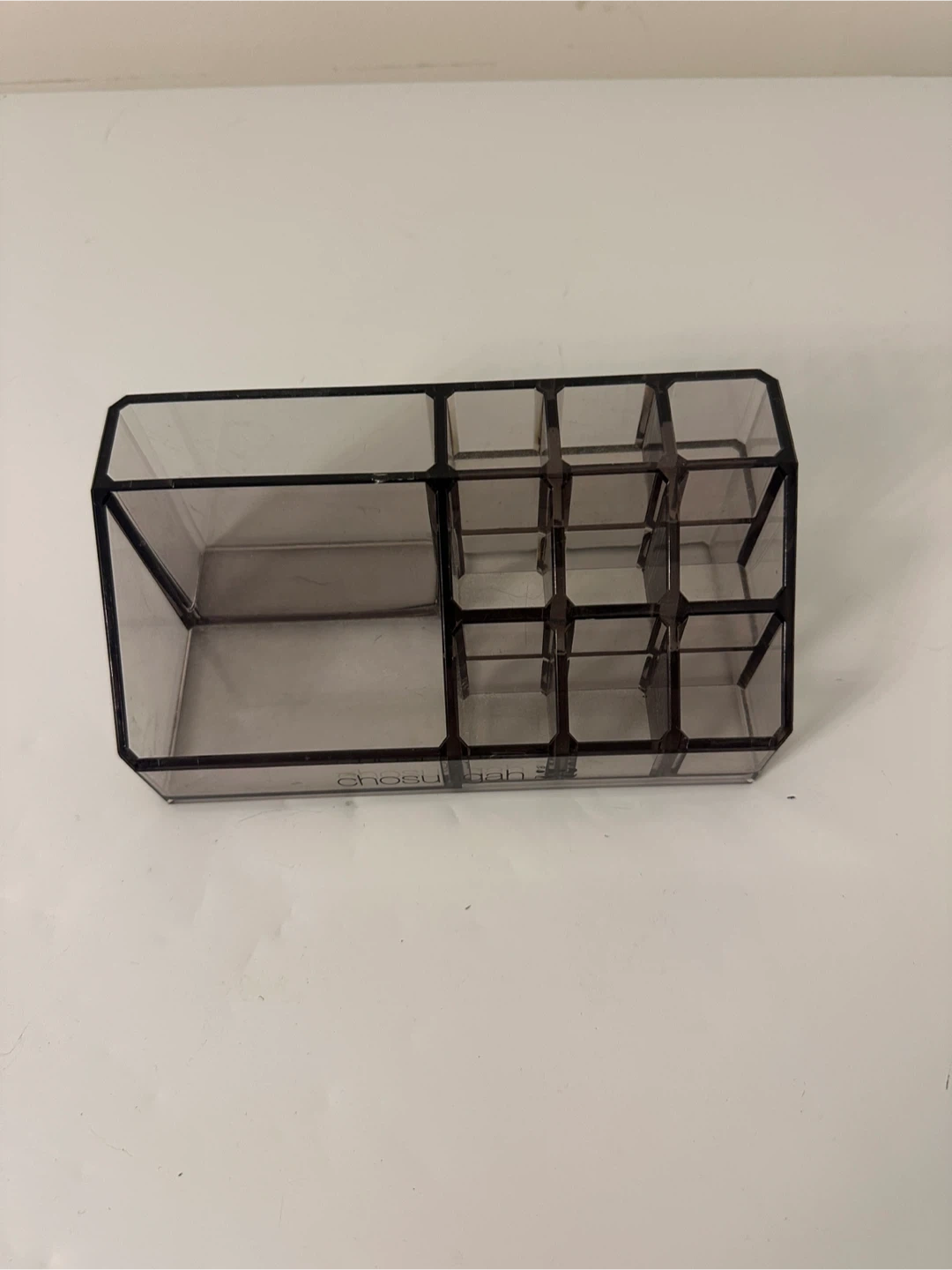 This is a Chosu Dah makeup organizer with multiple compartments. It's made of clear plastic with black trim. It's great for storing lipstick, brushes, or other small beauty items.