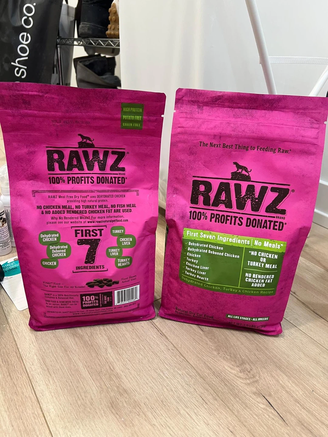 For free. This RAWZ Natural Dry Cat Food is high in protein and potato-free. It contains no chicken meal, turkey meal, or added rendered chicken fat. Natural dry cat food for all life stages and all breeds.