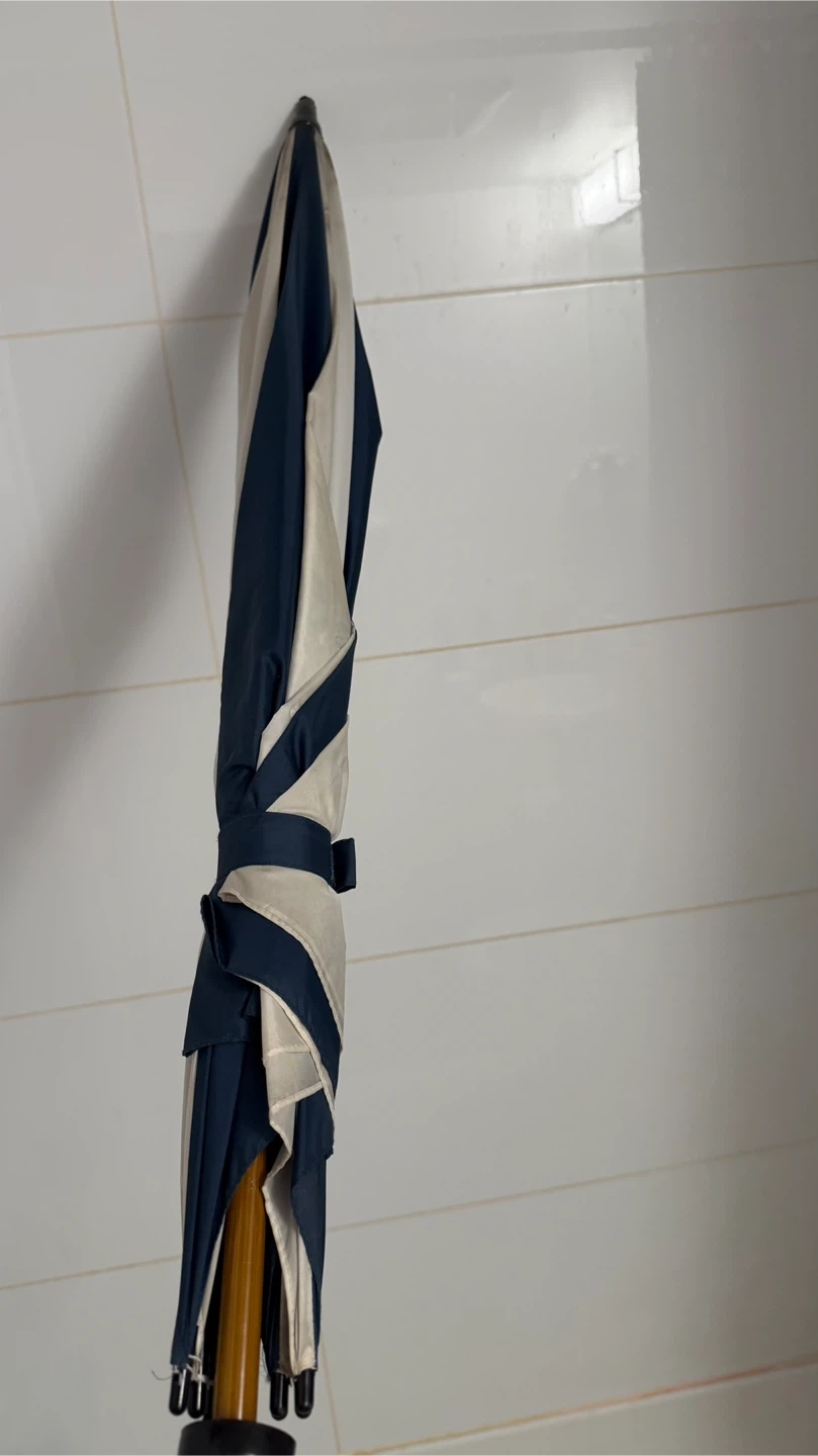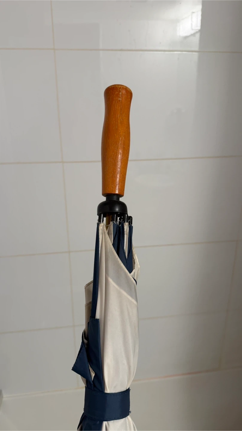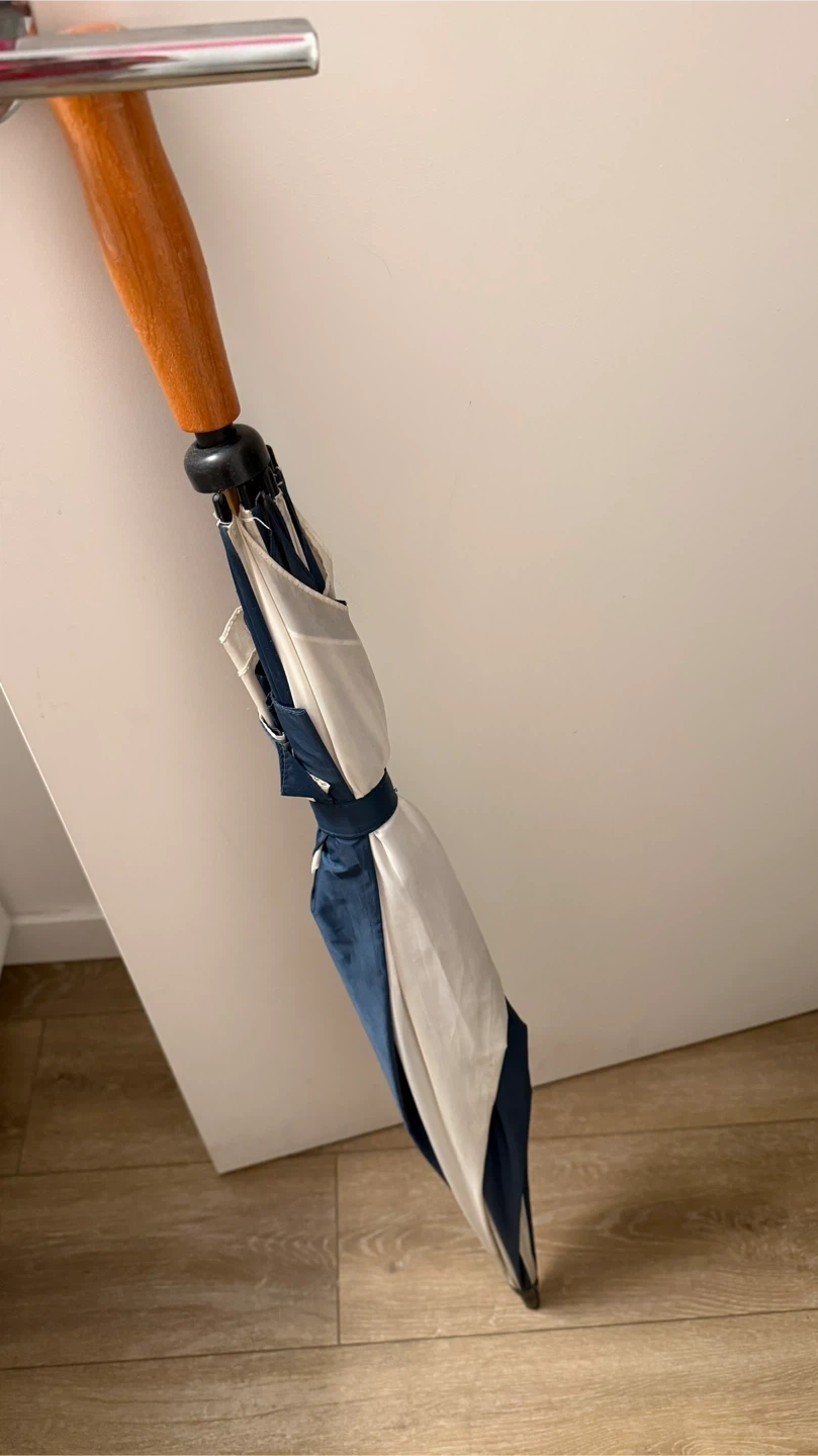 This umbrella features a classic navy and white stripe pattern. It has a smooth wooden handle and a secure tie strap for easy storage. Perfect for keeping dry on rainy days!