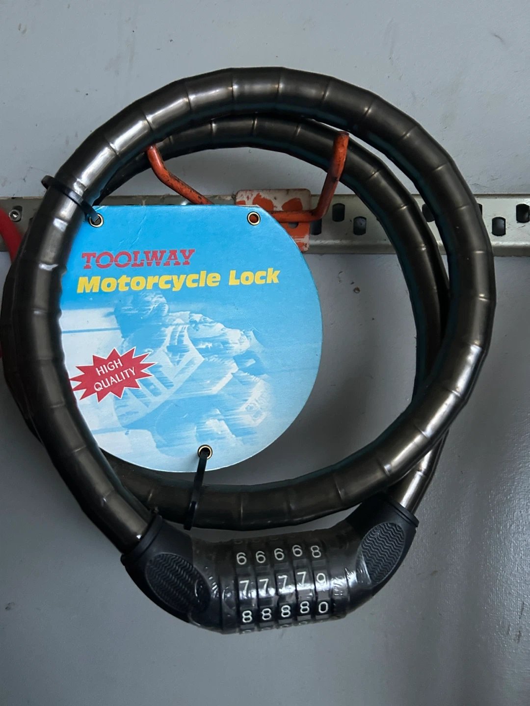 This is a TOOLWAY motorcycle brand new lock. It's a cable lock with a combination dial for security. It's a sturdy lock, great for keeping your motorcycle safe! Pls text 4164027666