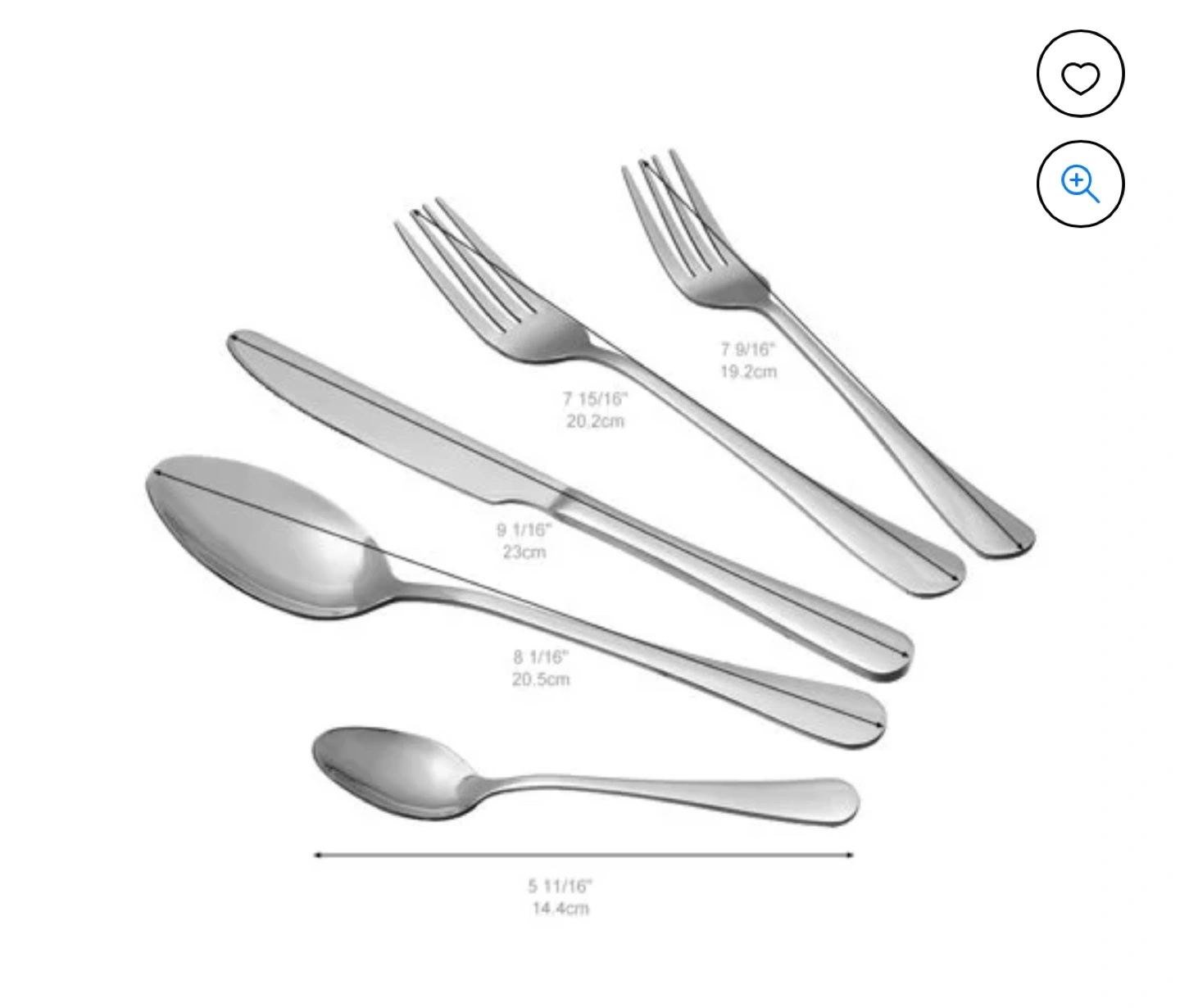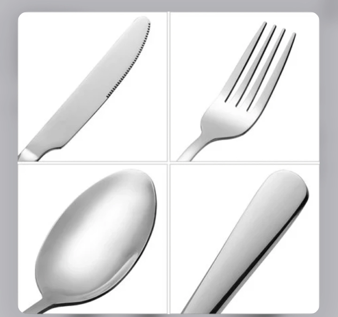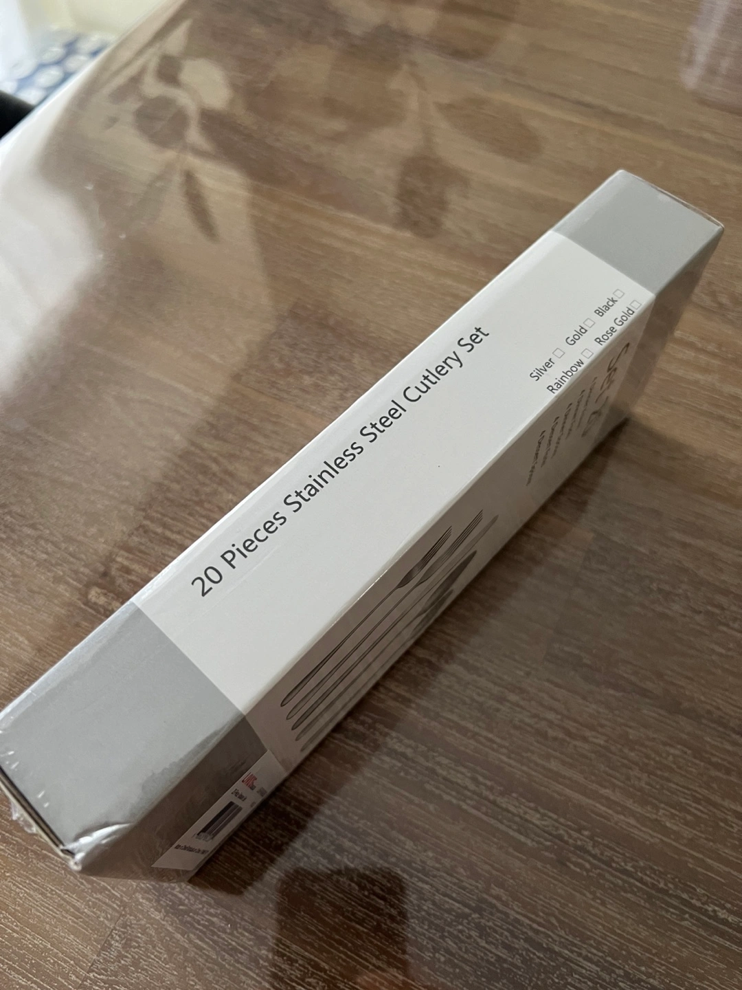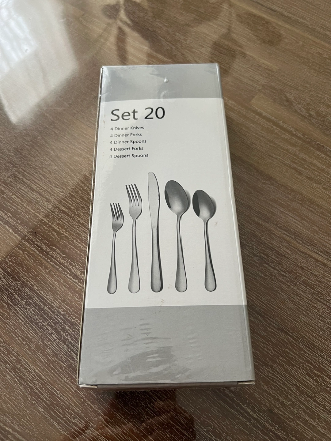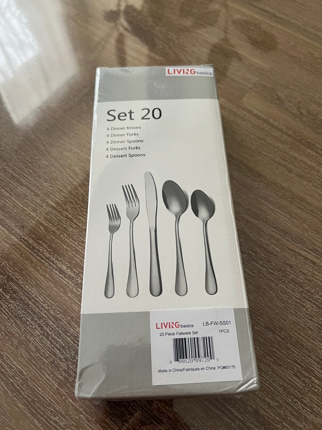 Living basics 20 piece stainless steel cutlery set, new in box. Includes 4 dinner knives, 4 dinner forks, 4 dinner spoons, 4 dessert forks, and 4 dessert spoons. Brand new, original packaging .