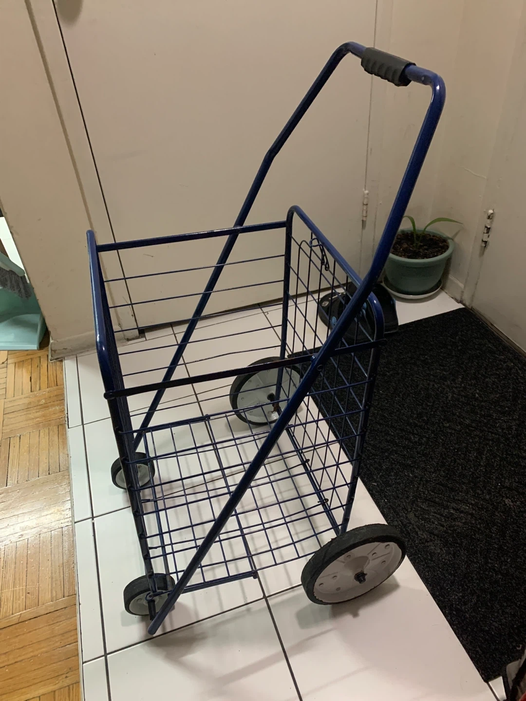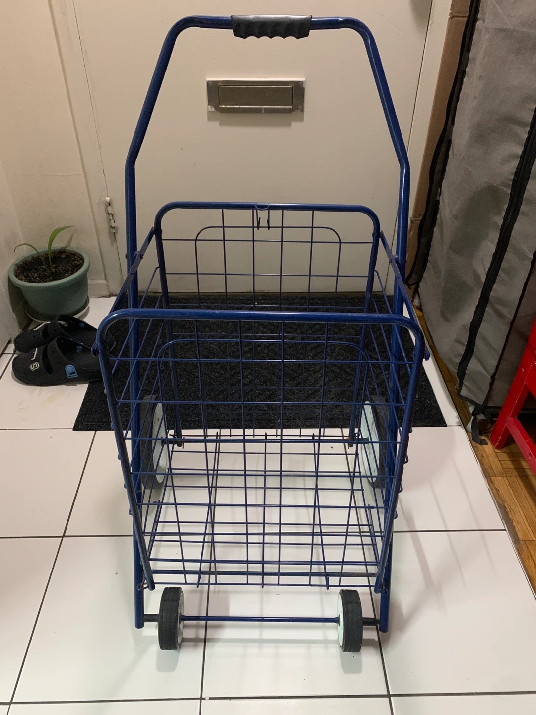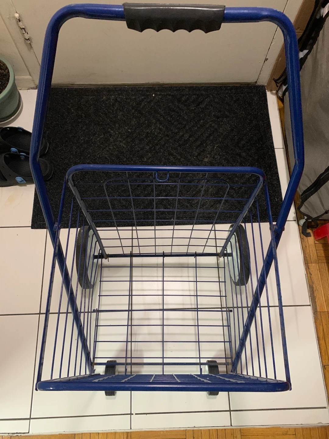 This blue wire shopping cart folds for easy storage. It has a durable metal frame and two wheels for smooth transport. Perfect for grocery runs or carrying laundry!