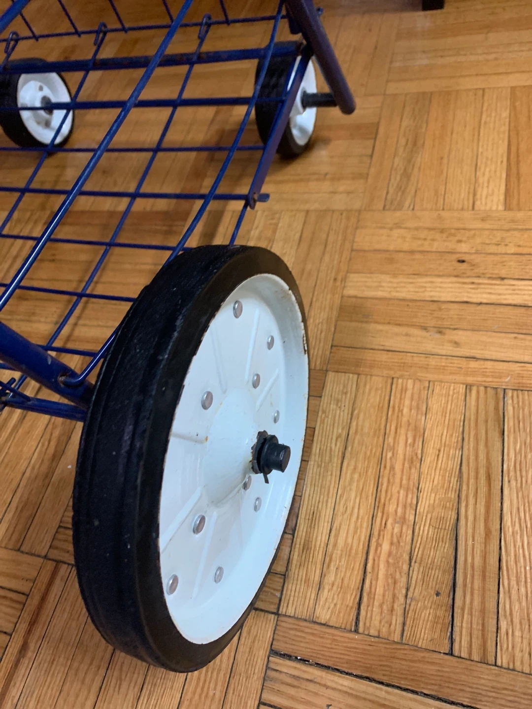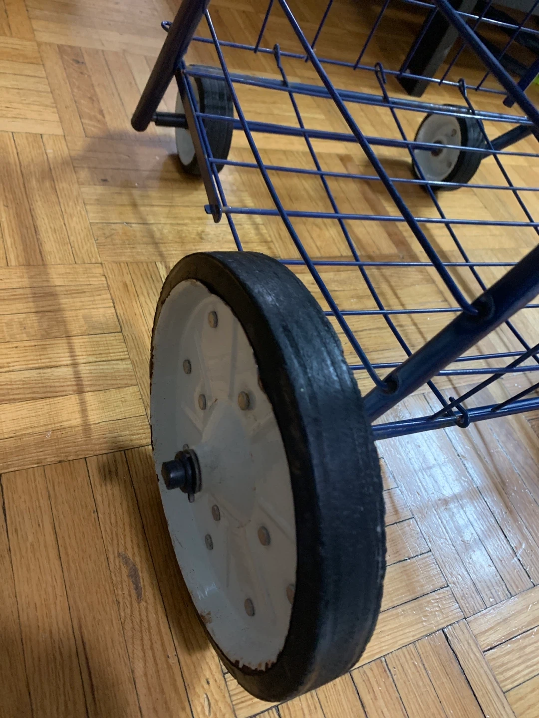 This blue wire shopping cart folds for easy storage. It has a durable metal frame and two wheels for smooth transport. Perfect for grocery runs or carrying laundry!