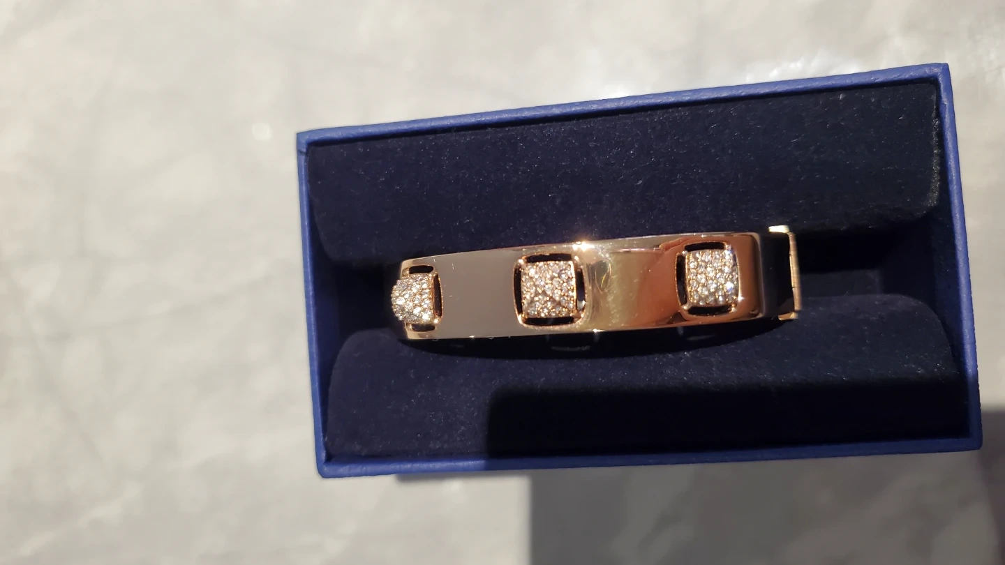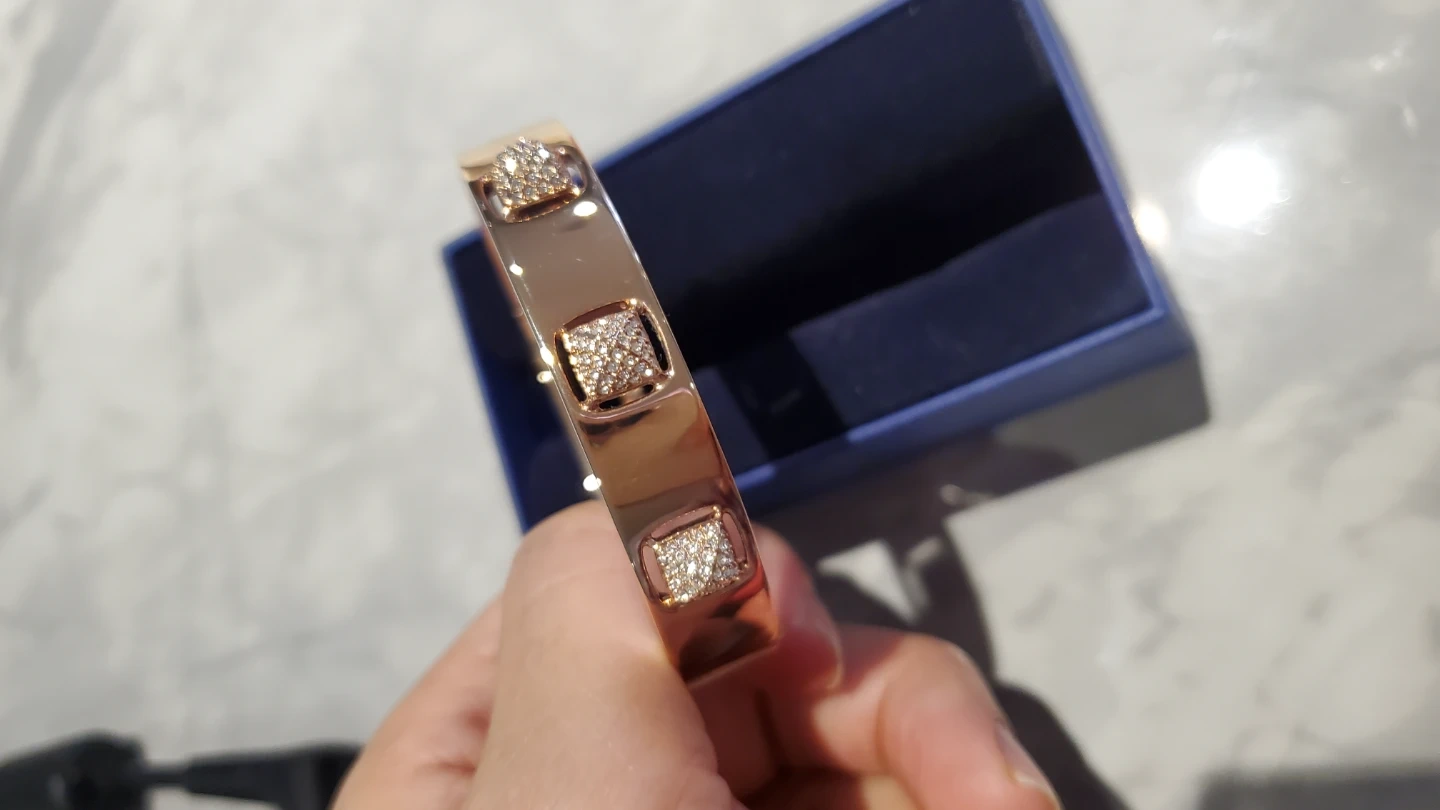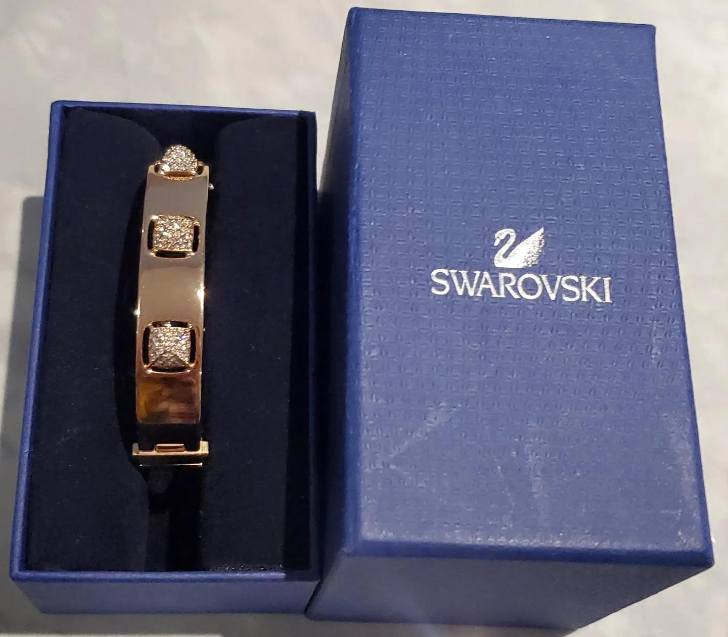 A rose gold tone bangle bracelet from Swarovski. It's embellished with clear crystals. Includes the original Swarovski box.