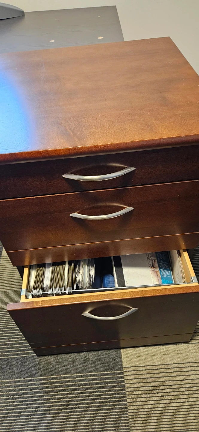 A sturdy 3-drawer filing cabinet in a dark brown wood finish. It has silver-toned handles for easy access to its drawers. This cabinet is great for organizing documents and office supplies.