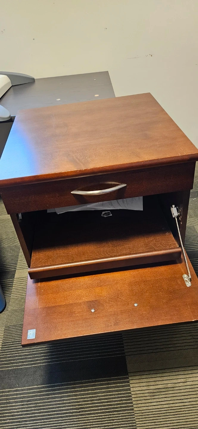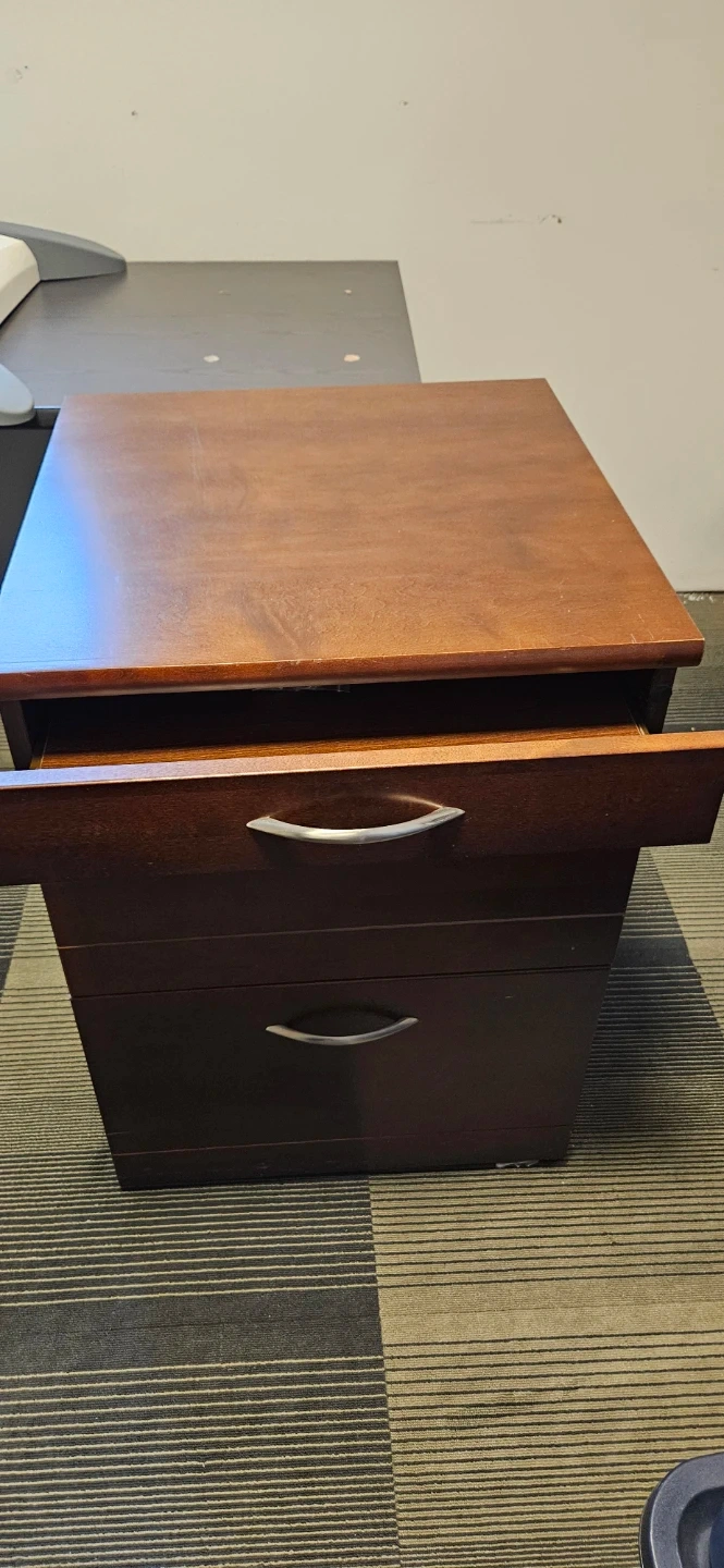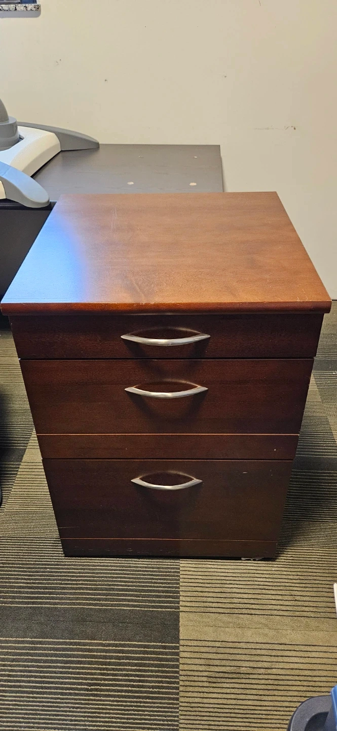 A sturdy 3-drawer filing cabinet in a dark brown wood finish. It has silver-toned handles for easy access to its drawers. This cabinet is great for organizing documents and office supplies.