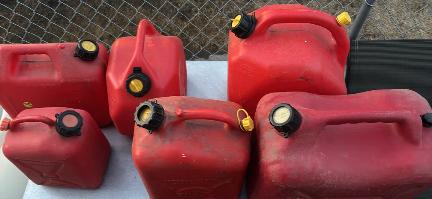 Five red plastic gasoline containers of various sizes. Includes one 5-gallon, one 10-litre, and three smaller cans. They are made of durable plastic with secure spouts.