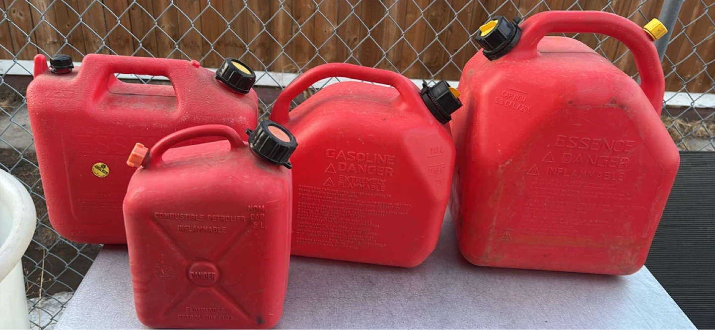 Five red plastic gasoline containers of various sizes. Includes one 5-gallon, one 10-litre, and three smaller cans. They are made of durable plastic with secure spouts.