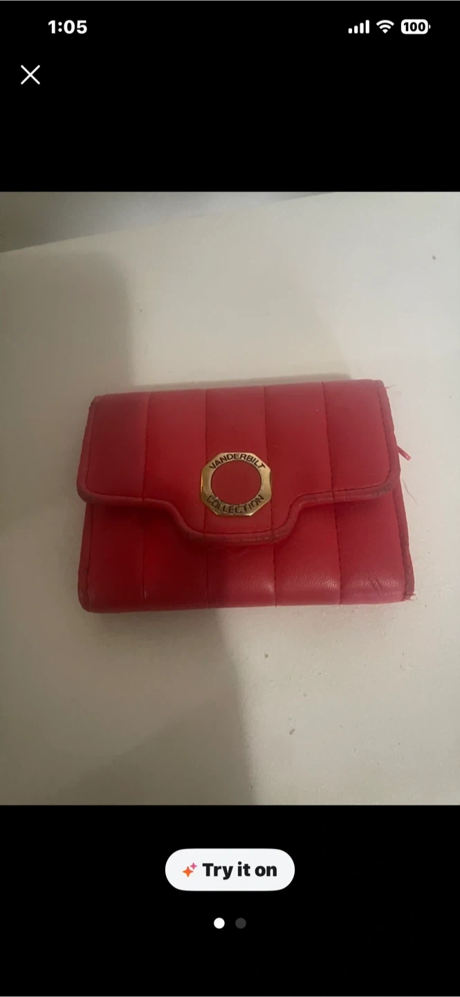 Red quilted wallet from the Vanderbilt Collection. It's made of leather and has a gold-tone emblem on the front. Useful for carrying cards and cash.