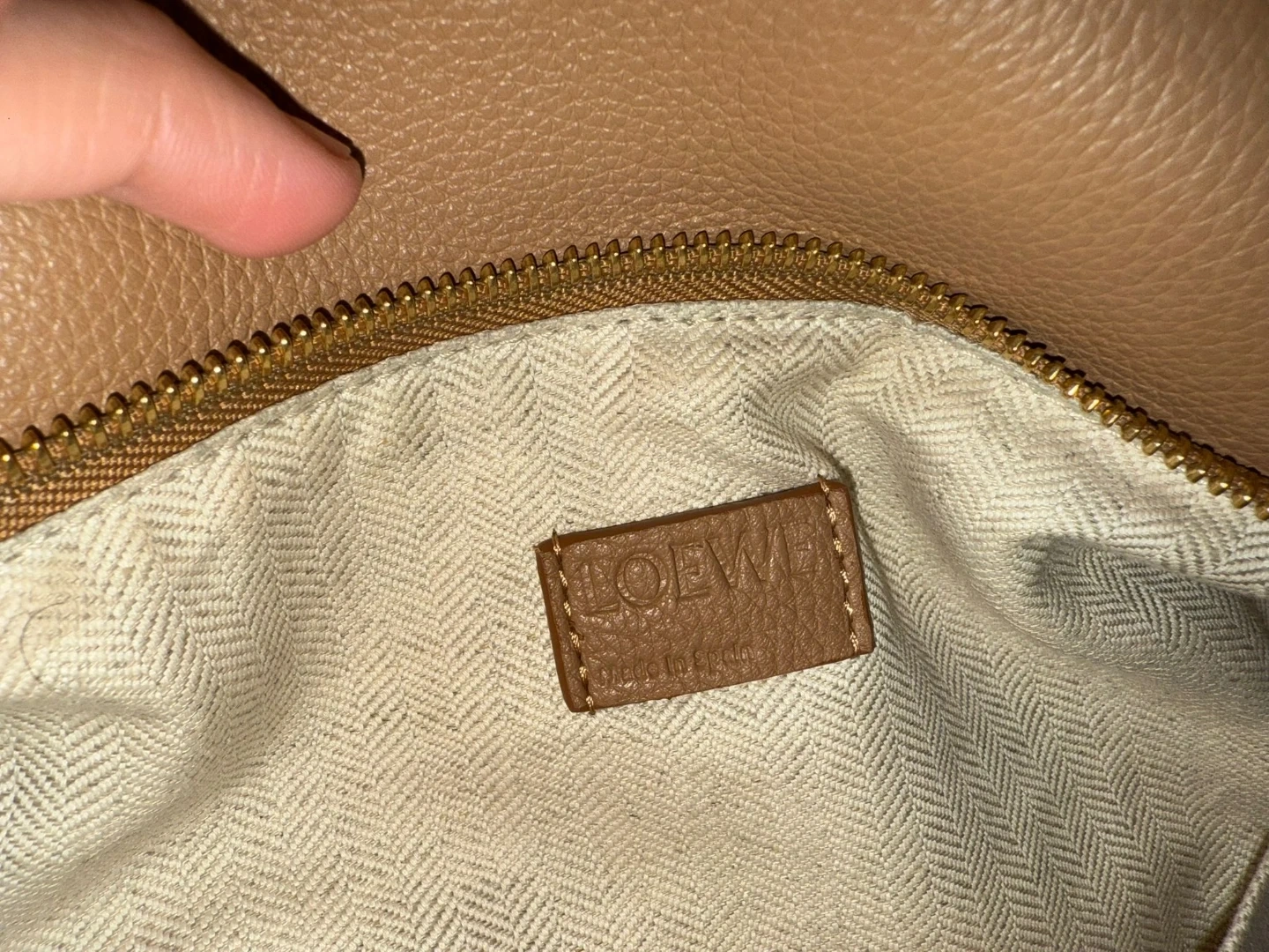 Loewe Puzzle bag in tan pebble leather. It's made in Spain and features a zip closure. This versatile bag can be carried by the top handle or with the shoulder strap.