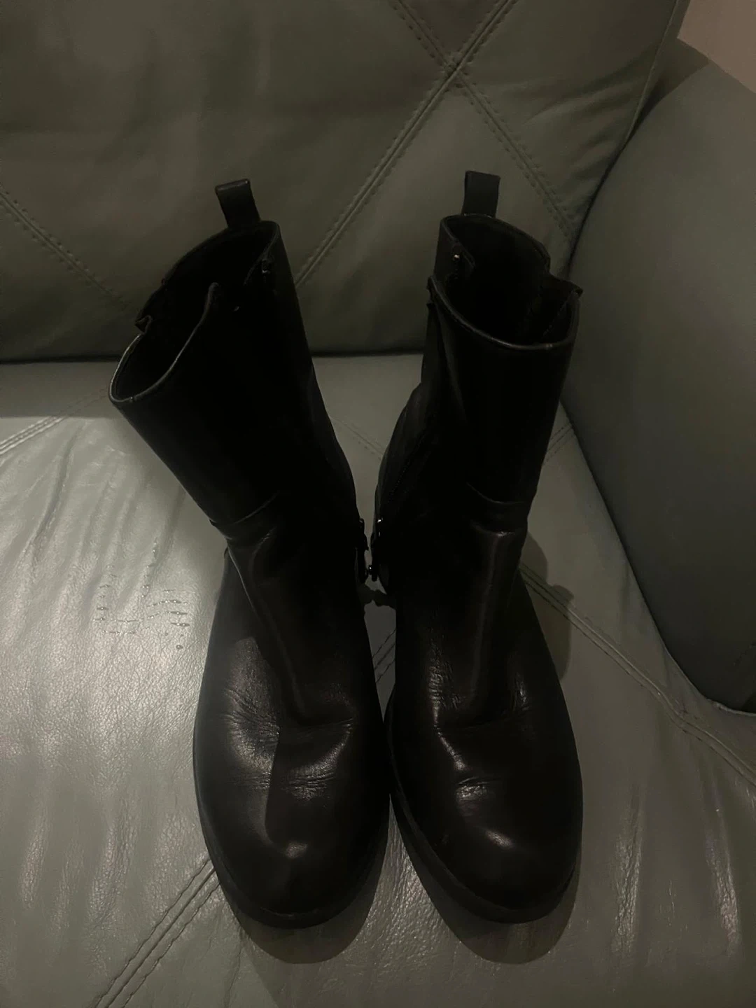 These stylish black leather ankle boots are a size 9M. They feature a comfortable man-made balance and a zipper closure for easy wear. Perfect for everyday use in cooler weather!